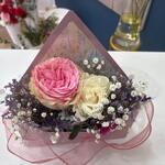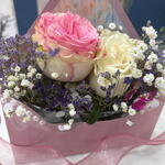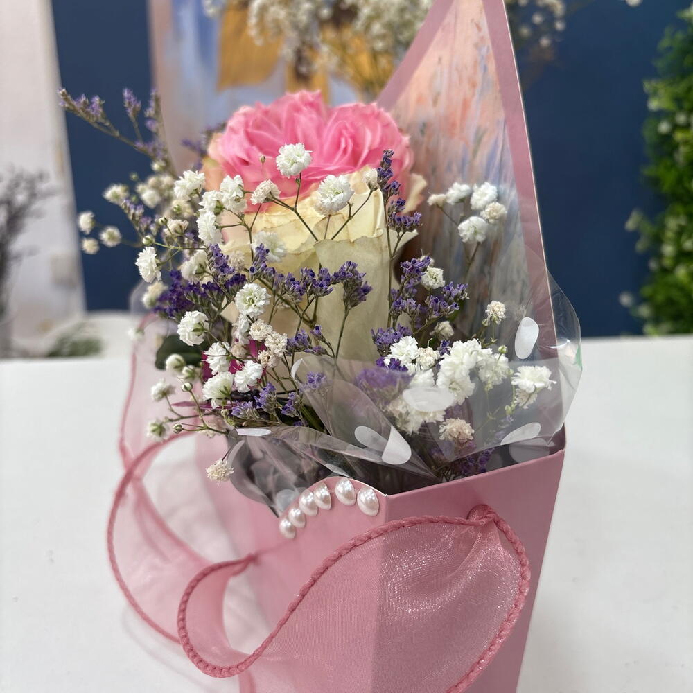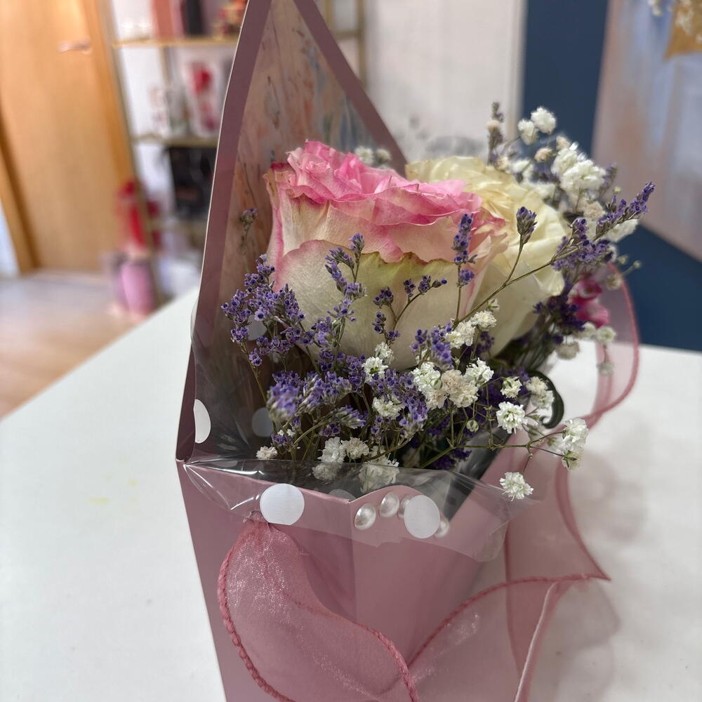 gypsofilia - 2 ud. rosa blanca - 1 ud. limonium purple - 3 ud. mariposa decorativa - 1 ud. tarjeta de felicitación - 1 ud. rosa roja o rosada - 1 ud.