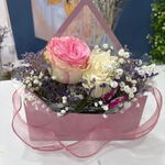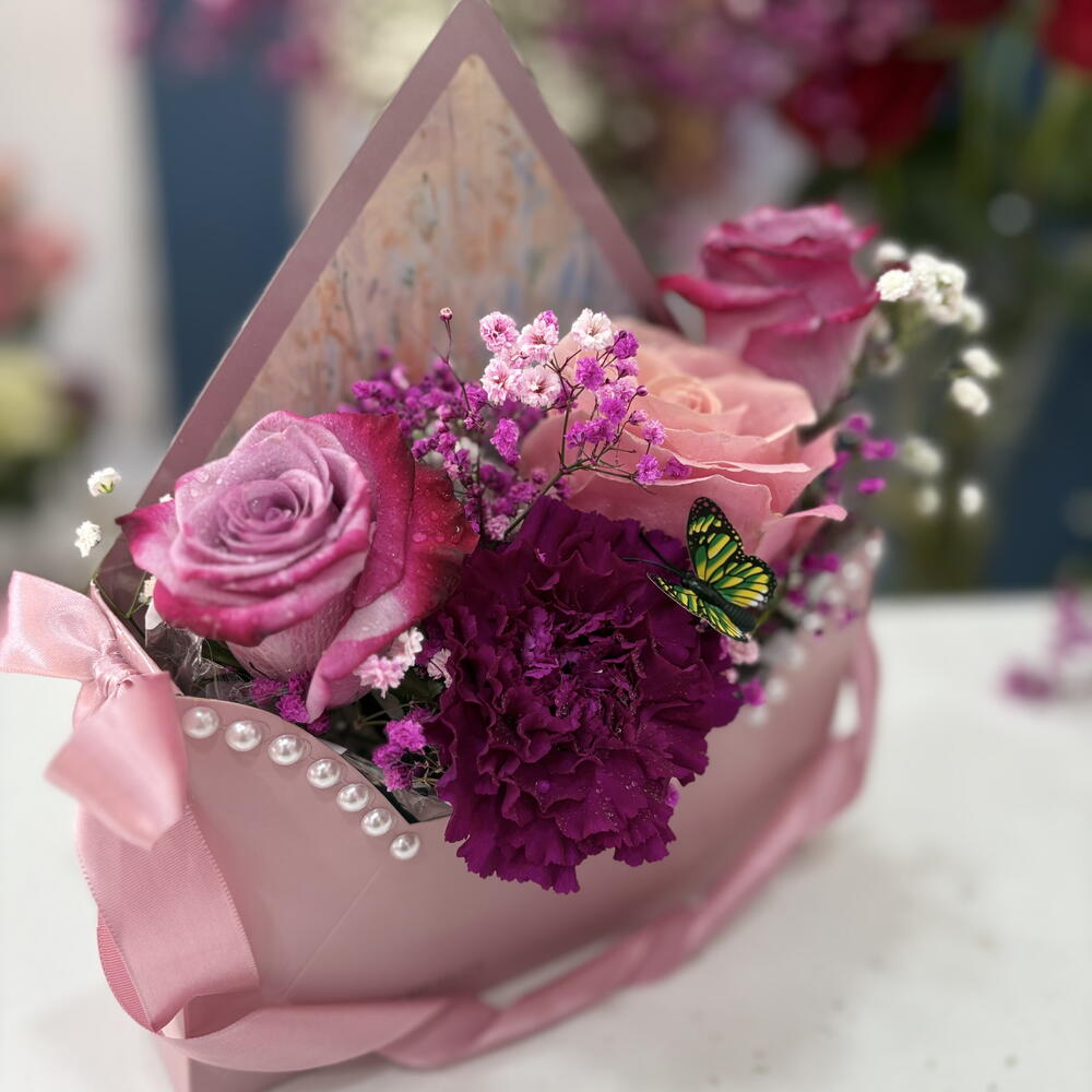 Hermosa caja de flores con dos rosas y Gypsofilia, Limonium y mariposas decorativas para sorprender. Viene incluida tarjeta de felicitación,