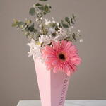 Un arreglo floral fresco y delicado presentado en una elegante caja rosa. La composición destaca por una gerbera rosa que aporta un toque vibrante y alegre, acompañada de margaritas blancas, paniculata y eucalipto, que añaden ligereza, volumen y un aroma natural muy agradable. Este diseño combina sencillez y elegancia, creando un detalle perfecto para regalar en cumpleaños, agradecimientos, celebraciones especiales o simplemente para sorprender a alguien con flores. La caja floral permite disfrutar del arreglo sin necesidad de jarrón, siendo también un bonito elemento decorativo para cualquier espacio. Incluye: Gerbera rosa Margaritas blancas Paniculata Eucalipto natural Presentación en caja rosa decorativa Un detalle floral luminoso, delicado y lleno de encanto. 🌸