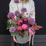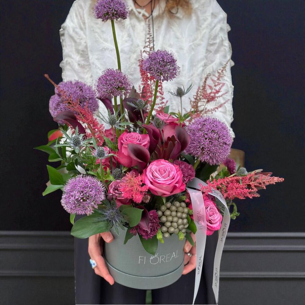 Caja floral elegante con rosas fucsia y allium purpura – Arreglo de lujo en tonos violeta y frambuesa