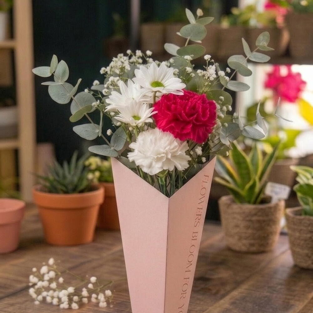 Un arreglo floral elegante y delicado presentado en una caja rosa de diseño moderno. Esta composición combina la suavidad de los claveles rosados y blancos, la frescura de las margaritas blancas, el toque etéreo de paniculata y la belleza natural del eucalipto, creando un ramo armonioso y lleno de encanto. Su estilo ligero y romántico lo convierte en el detalle perfecto para sorprender en cumpleaños, agradecimientos, celebraciones especiales o simplemente para alegrar el día de alguien especial. La caja floral permite colocar el arreglo directamente en cualquier espacio sin necesidad de jarrón, convirtiéndolo también en un precioso elemento decorativo. Características del arreglo: Claveles rosados y blancos Margaritas blancas Paniculata Eucalipto natural Presentación en elegante caja rosa Un detalle delicado que transmite frescura, cariño y elegancia.
