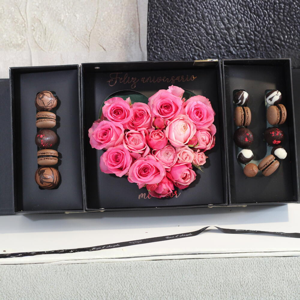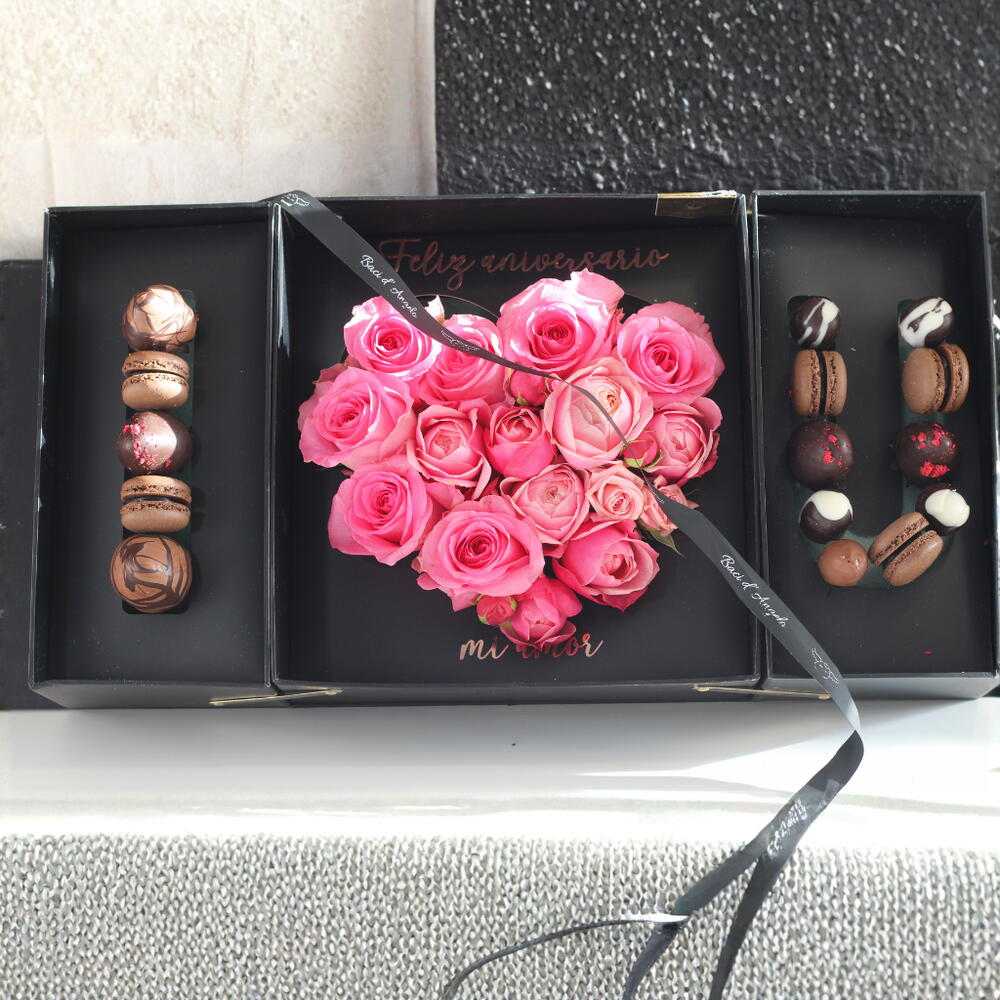Macarons - 5 ud. rosas rosadas - 6 ud. fresas con chocolate - 5 ud. bombones artesanales - 5 ud. caja i love u de alta calidad - 1 ud. varas de mini rosas - 5 ud.