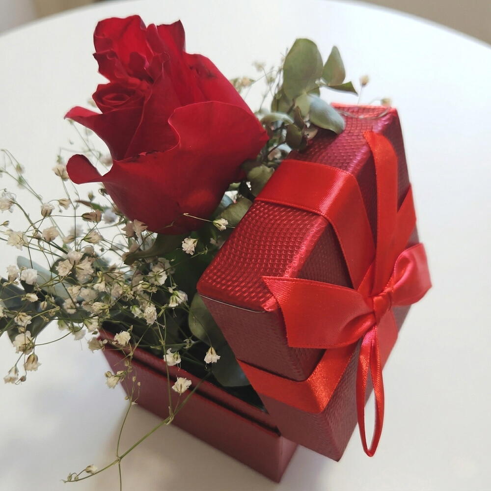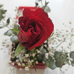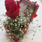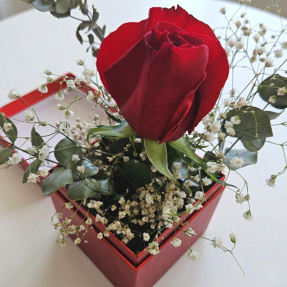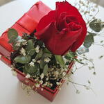 Una elegante rosa roja presentada en una delicada caja regalo que simboliza amor, pasión y romanticismo. Su diseño compacto y sofisticado la convierte en un detalle perfecto para sorprender con un gesto lleno de significado. La combinación de la rosa con finos toques de paniculata y hojas verdes aporta frescura y armonía al arreglo. Este detalle es ideal para ocasiones como San Valentín, aniversarios, propuestas o momentos especiales llenos de emoción. La caja decorativa realza la presentación, haciendo que el regalo sea aún más especial desde el primer vistazo. Su formato práctico permite regalarla fácilmente sin necesidad de preparación adicional. Para su cuidado, se recomienda añadir una pequeña cantidad de agua en la base, mantenerla en un lugar fresco, evitar la luz solar directa y retirar las flores marchitas para prolongar su belleza.