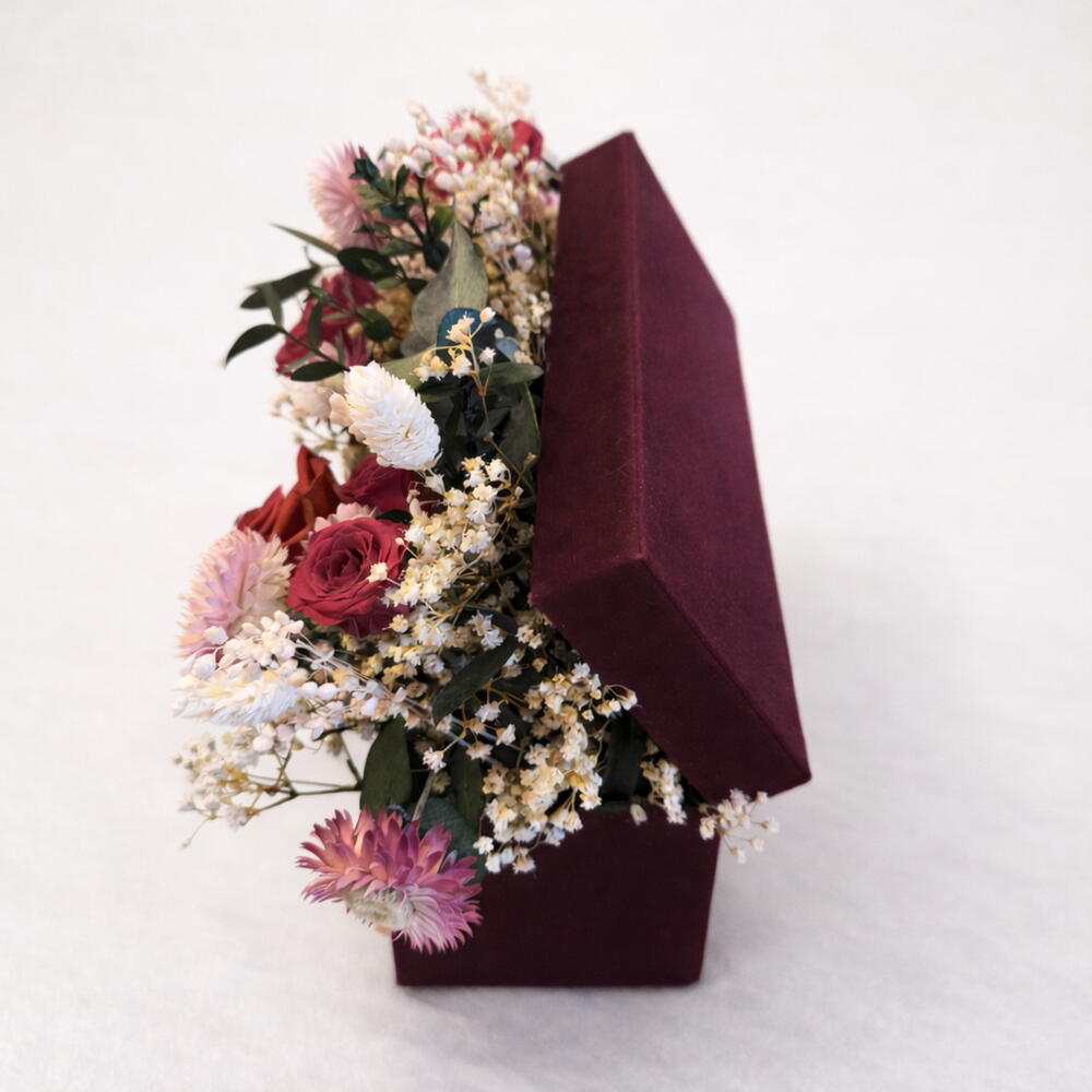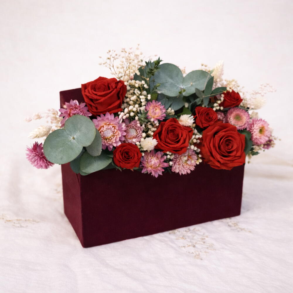 eucalipto preservado - 10 ud. paniculata preservada cruda - 10 ud. phalaris blanco - 6 ud. rosas preservadas varios tamaños - 6 ud. helichrysum color rosa - 10 ud. caja granate acabado aterciopelado - 1 ud. tarjeta regalo a juego - 1 ud.