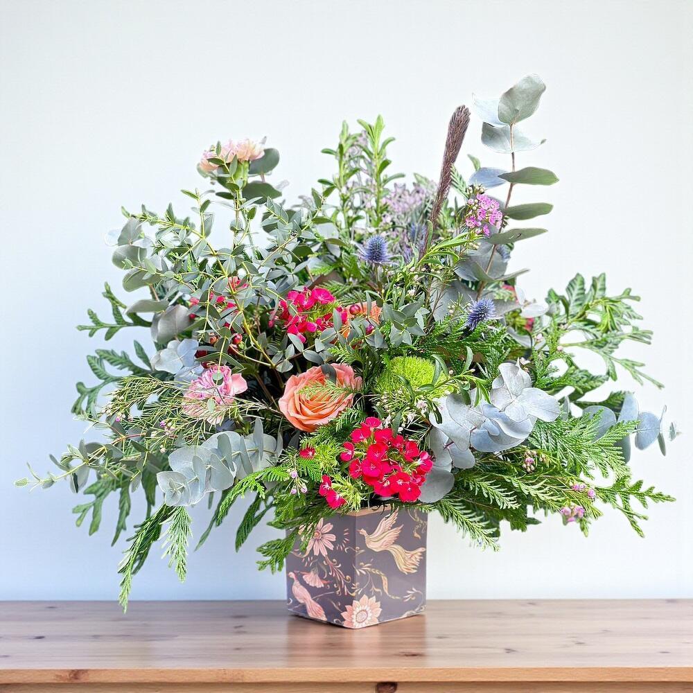 Arreglo Floral Silvestre con Eucalipto y Rosas en Caja Decorativa – Ramo Natural Grande