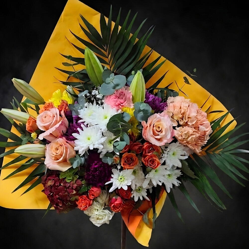 Captura la calidez de un atardecer inolvidable con esta vibrante composición. Este ramo es una celebración de los tonos tierra y fuego, donde las rosas color salmón y los claveles en tonos melocotón armonizan con la frescura de las margaritas blancas. Las pequeñas rosas de pitiminí naranja añaden destellos de luz, mientras que las majestuosas hojas de palma crean una estructura arquitectónica y exótica. Envuelto en un papel amarillo intenso que irradia energía, este arreglo es el regalo ideal para celebrar éxitos, agradecer con el corazón o simplemente llenar de vitalidad cualquier rincón del hogar