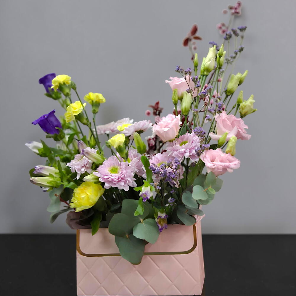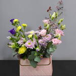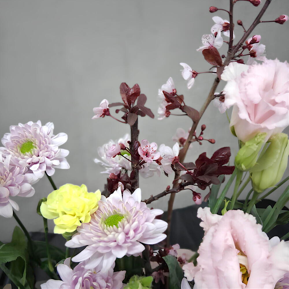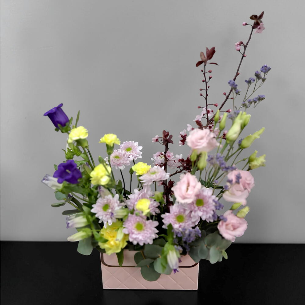 Limonium - 1 ud. crisantemo - 1 ud. clavel - 3 ud. eucalipto cinerea - 1 ud. campanula - 2 ud. lisianthus rosa - 2 ud. Oasis Clásico Ladrillo 35 23X11X8Cm - 1 ud. cajita de cartón - 1 ud. ramitas de cerezo - 2 ud.