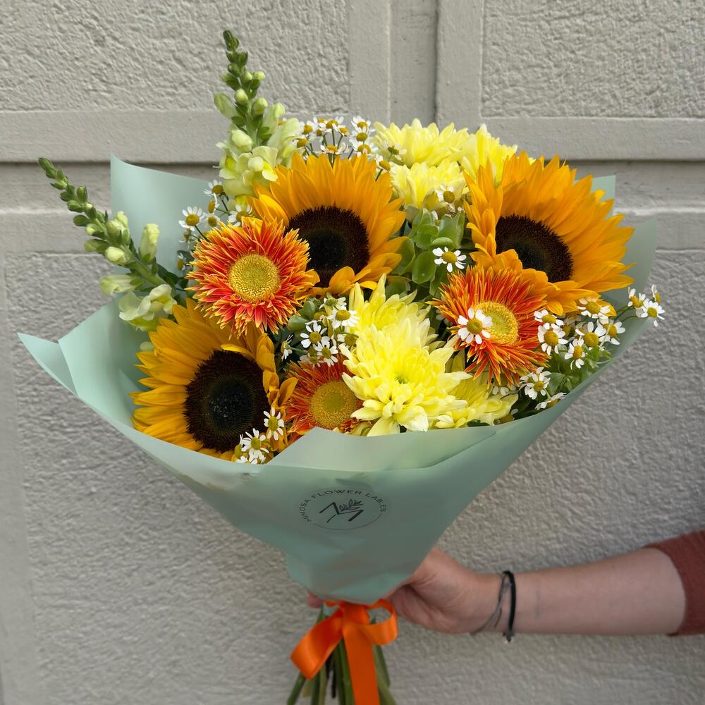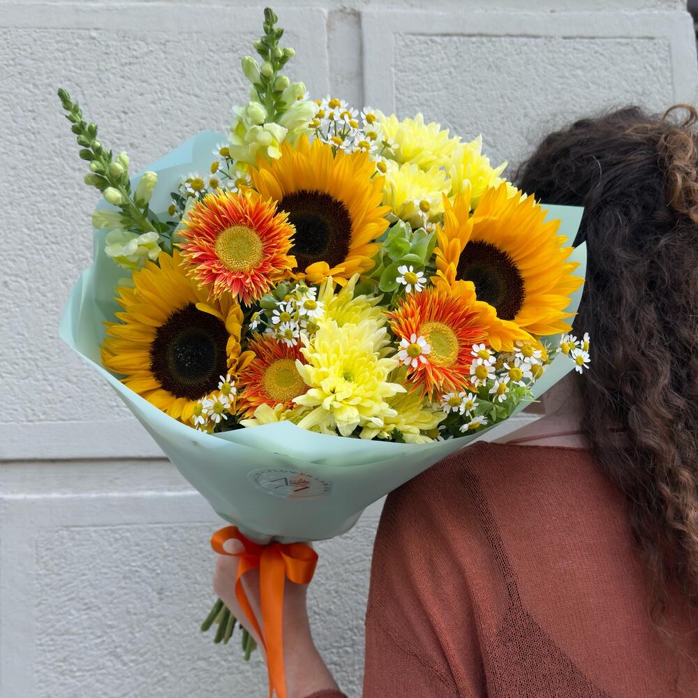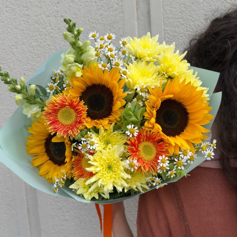 El crisantemo - 2 ud. Anthurium - 2 ud. germini - 3 ud. girasol - 3 ud. tanacetum spray daisy - 3 ud.