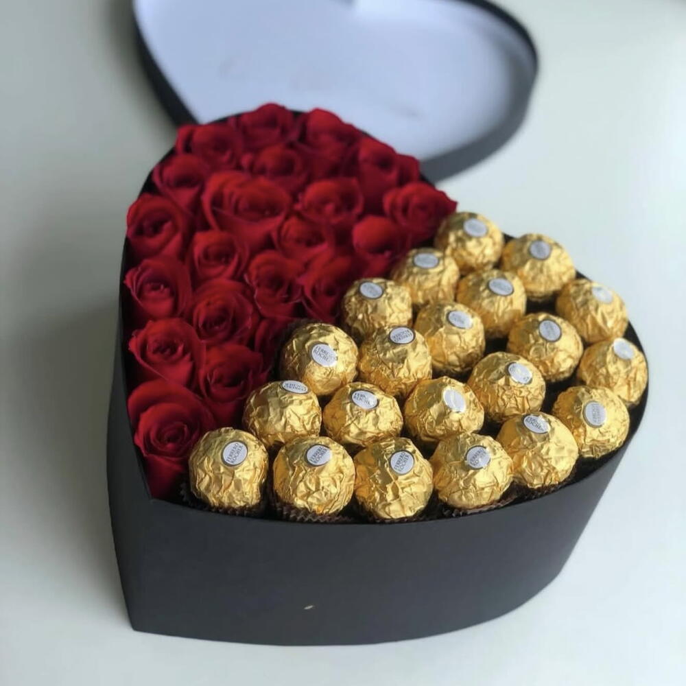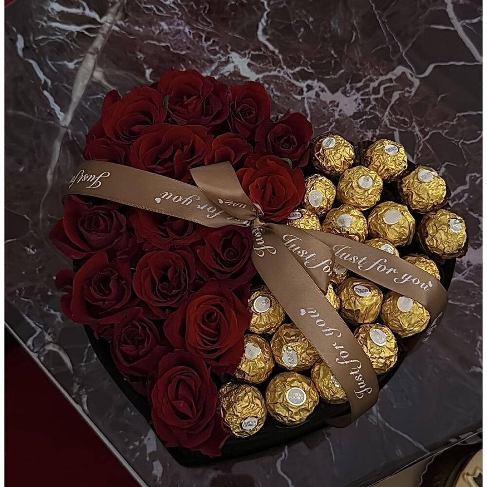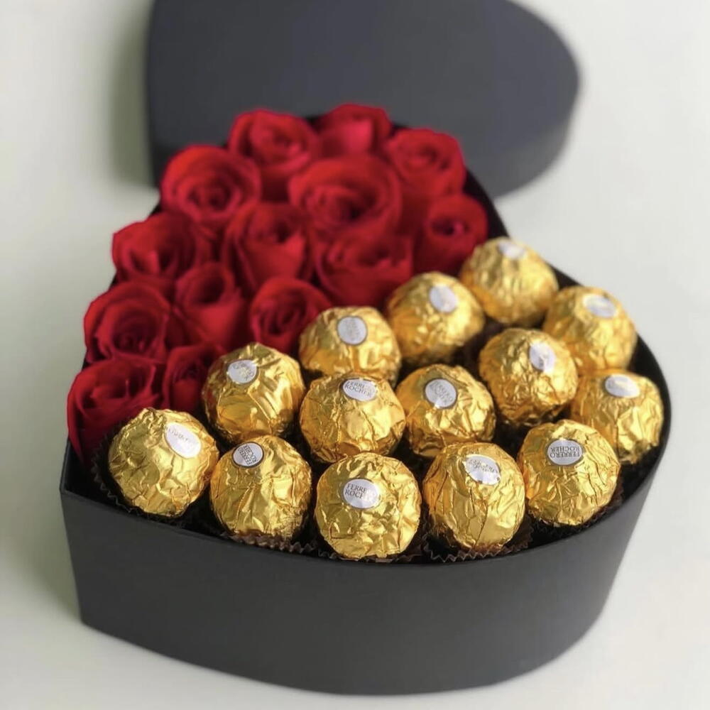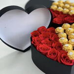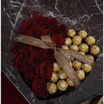 Caja premium corazon con flores frescas y ferrero Rocher