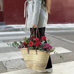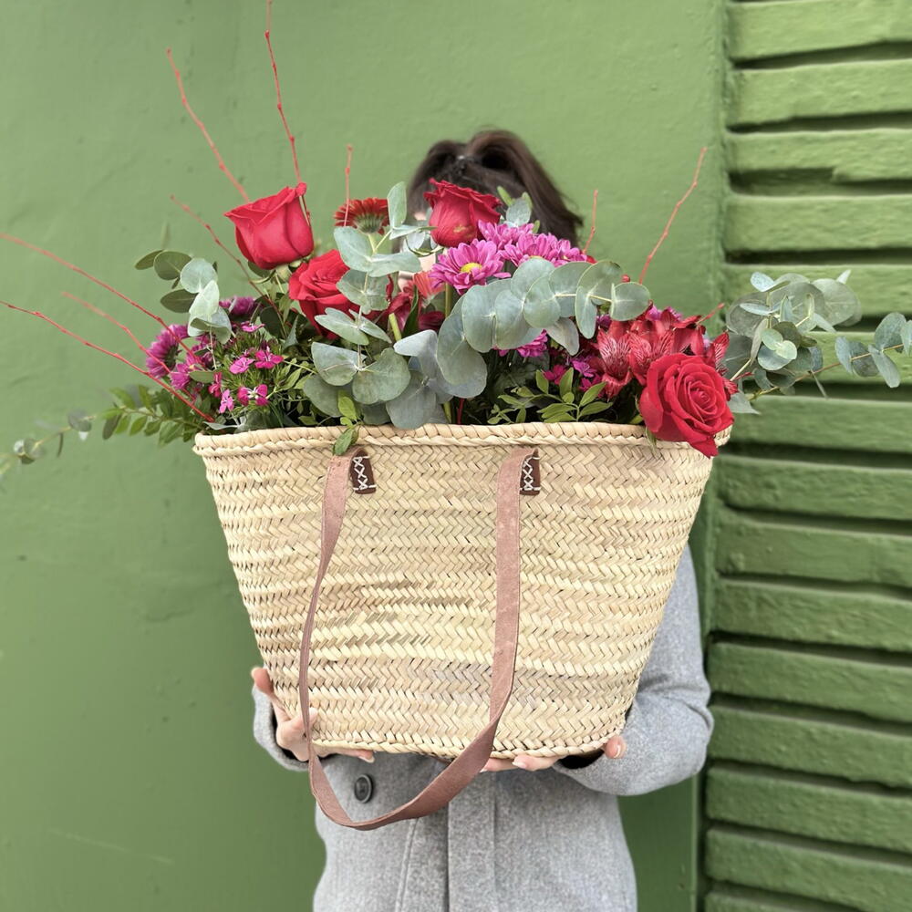 eucalipto - 5 ud. rosas rojas - 5 ud. flor de relleno - 1 ud. Gerbera rojas - 2 ud. verde decorativo variado - 1 ud. crisantemos margarita spray morada - 2 ud. cesta de mimbre capazo - 1 ud.