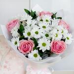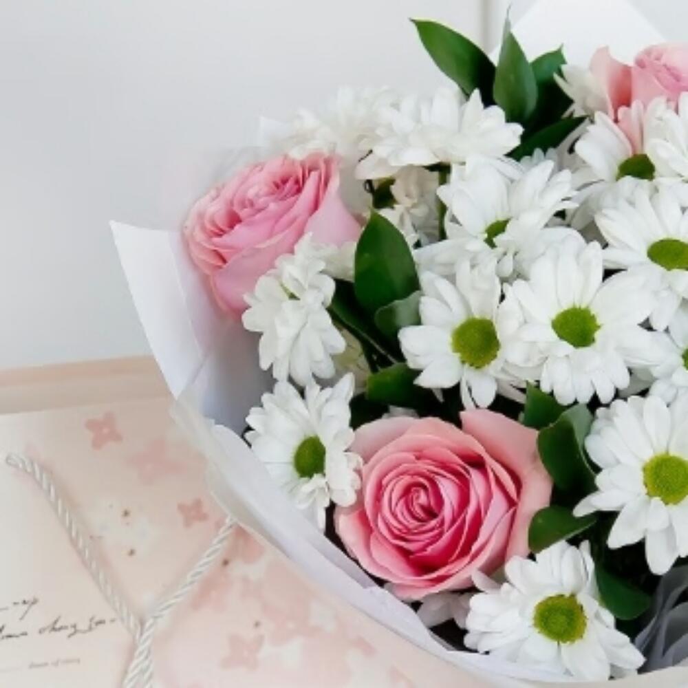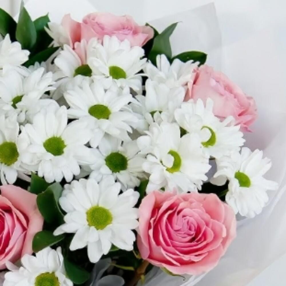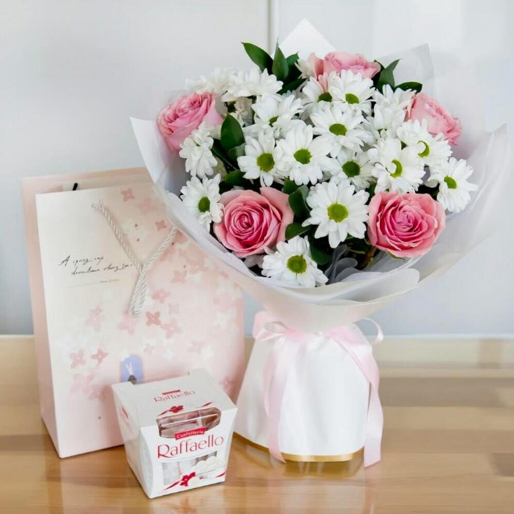 Este Ramos clásicos es el regalo perfecto para transmitir tus sentidos cariños. Compuesto por 4 hermosas margaritas blancas, 5 rosas de un encantador color rosa, 3 verdes variados para dar vida y textura al conjunto, y acompañado con un detallito dulce, un bombón Rafaello. Es la combinación perfecta de delicadeza, frescura y elegancia, hecho para alegrar cualquier ocasión especial.