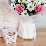 verdes variados - 3 ud. margaritas blancas - 4 ud. bombones rafaello - 1 ud. rosa hermosa rosa - 5 ud.
