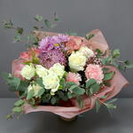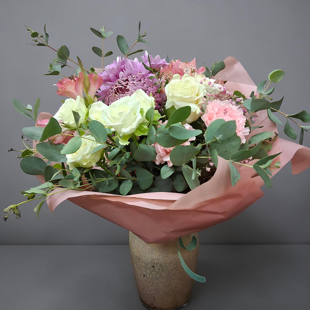 Alstroemeria - 2 ud. paniculata - 1 ud. cinta de raso - 1 ud. rosa blanca - 2 ud. rosa ramificada blanca - 1 ud. verde variado - 5 ud. clavel columbiano - 2 ud. papel decorativo - 2 ud.