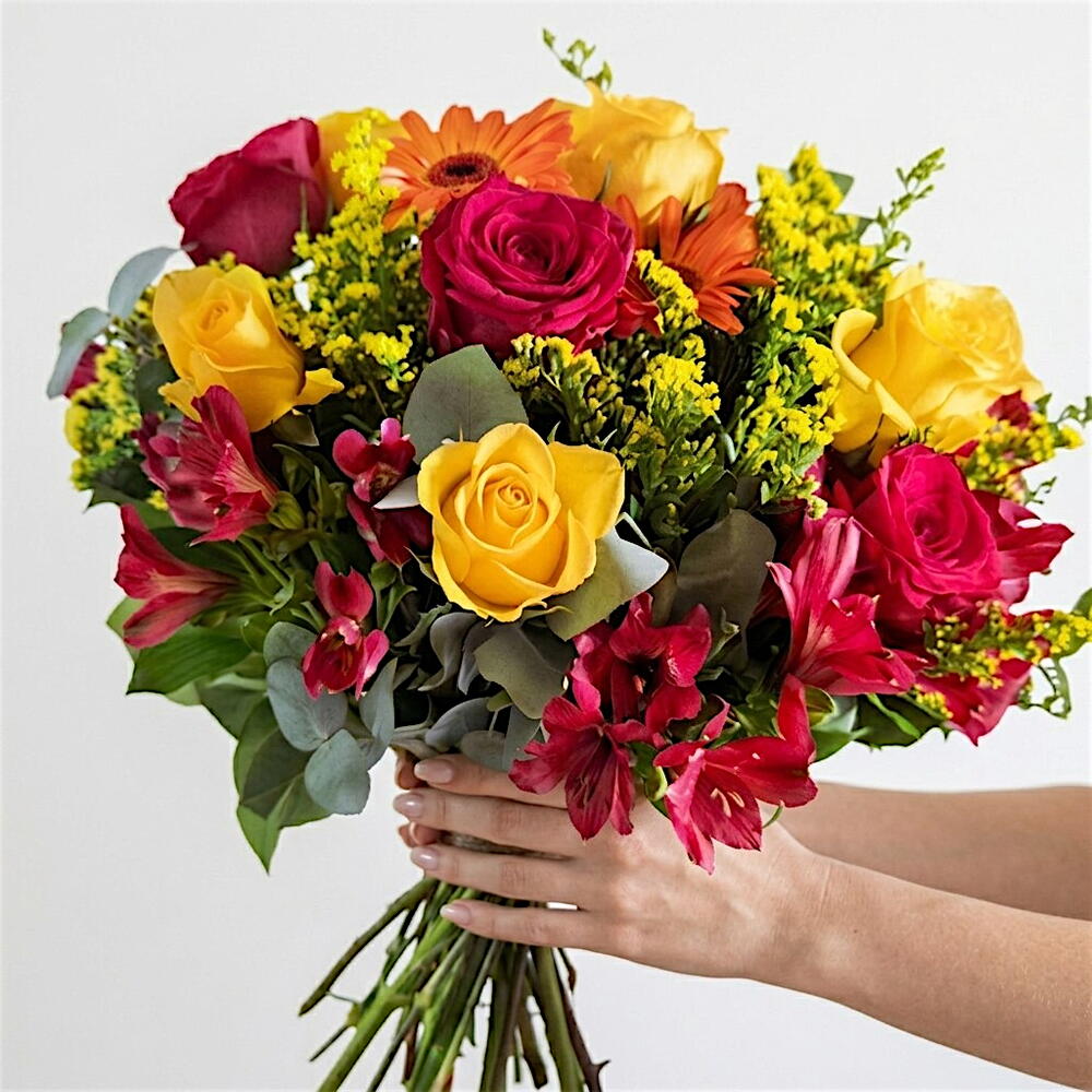Solidago - 4 ud. rosas - 5 ud. claveles - 12 ud. verdes variados - 1 ud. astromelia - 8 ud.
