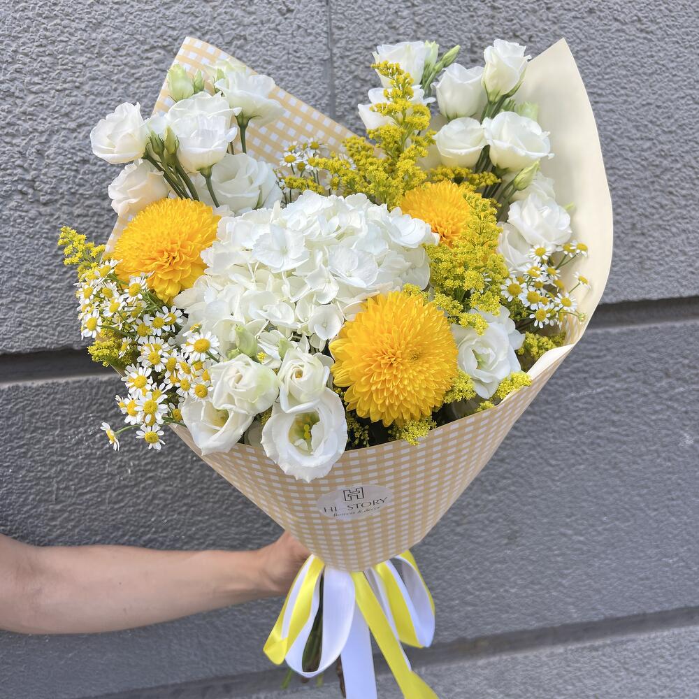 Solidago - 4 ud. hortensia - 1 ud. Lisianthus - 4 ud. margaritas - 2 ud. crisantemos - 3 ud.