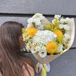 Descubre la pura elegancia y sofisticación con este espléndido ramo de flores de autor. Compuesto por 4 tallos de Solidago, aportando sus toques dorados de alegría y luz, se une a 1 lujosa Hortensia transmitiendo corazón y emociones sinceras. Las 4 elegantes Lisianthus aportan una delicada belleza y encanto junto a 2 Margaritas sinónimos de pureza e inocencia. El ramo se completa con 3 Crisantemos que representan la eternidad y el amor. Este arreglo es más que un simple ramo de flores, es una conmovedora obra de arte floral.