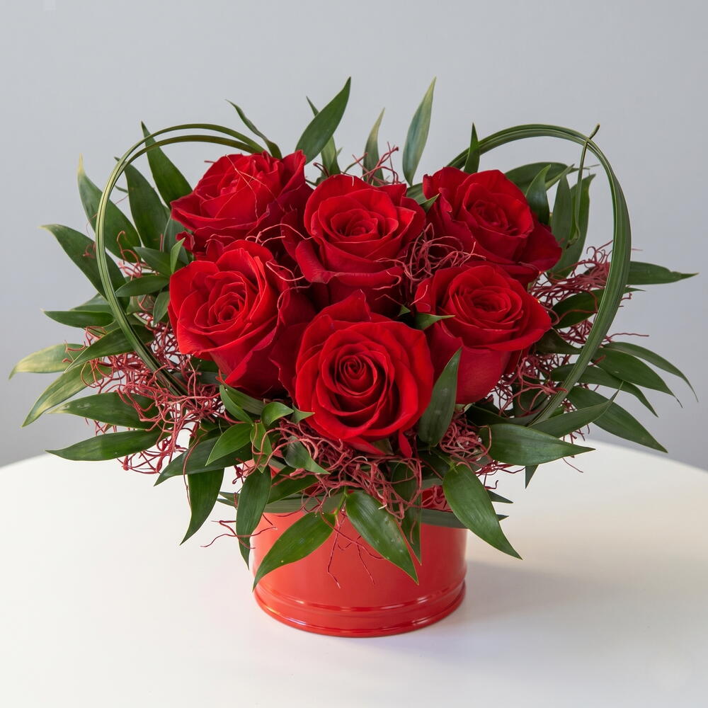Un arreglo floral elegante y lleno de pasión que destaca por su forma en corazón, ideal para expresar amor y sentimientos profundos. Las rosas rojas, símbolo clásico del romance, se presentan en una composición compacta y armoniosa, rodeadas de un delicado follaje verde que realza su intensidad. Su base moderna en tono rojo aporta un toque sofisticado y decorativo, perfecto para cualquier ocasión especial. Este diseño combina belleza y estilo en una pieza única que no pasa desapercibida. Es un regalo ideal para aniversarios, San Valentín o momentos inolvidables. Para conservar su frescura, mantén el arreglo en un lugar fresco, añade agua regularmente a la base y evita la exposición directa al sol. Retira hojas o pétalos marchitos para prolongar su duración.