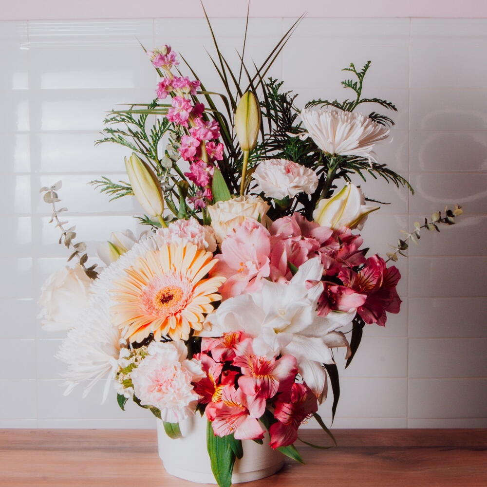 Gerbera - 2 ud. Lilium - 1 ud. rosas - 2 ud. margaritas - 2 ud. paniculata - 2 ud. claveles - 4 ud. astromelias - 3 ud. verdes varios - 5 ud. alhelí - 1 ud.