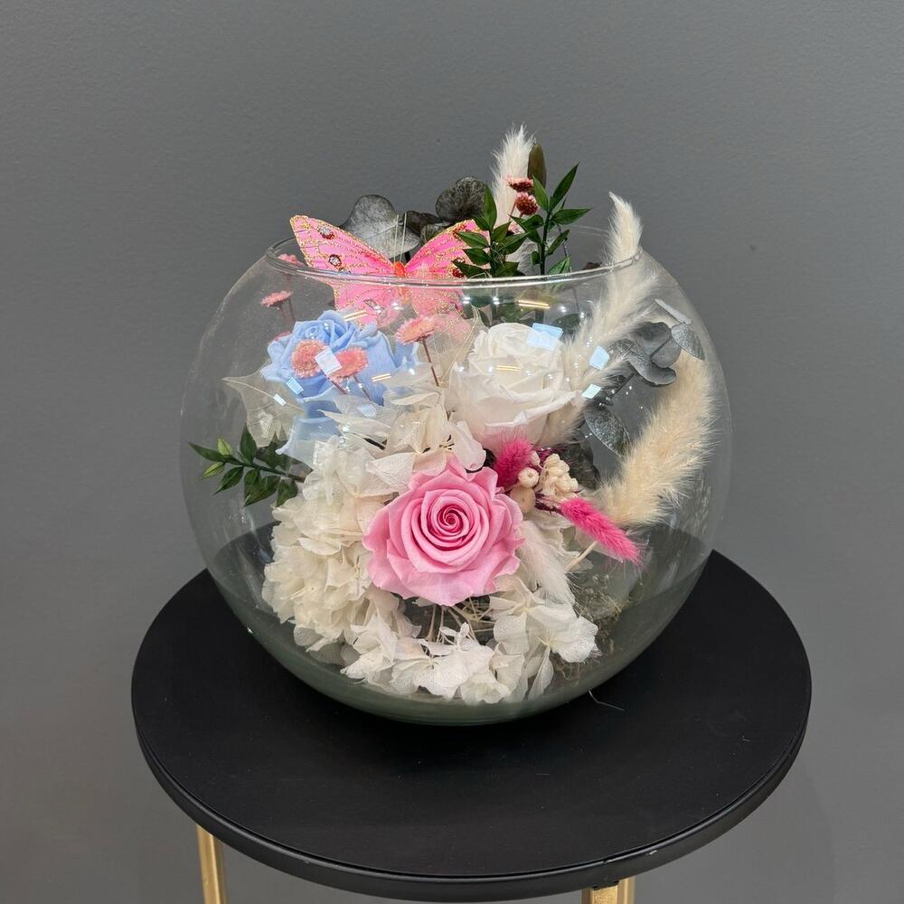 hortensia - 1 ud. rosa preservada - 3 ud. cupula - 1 ud. musgo - 1 ud.