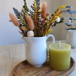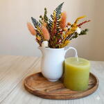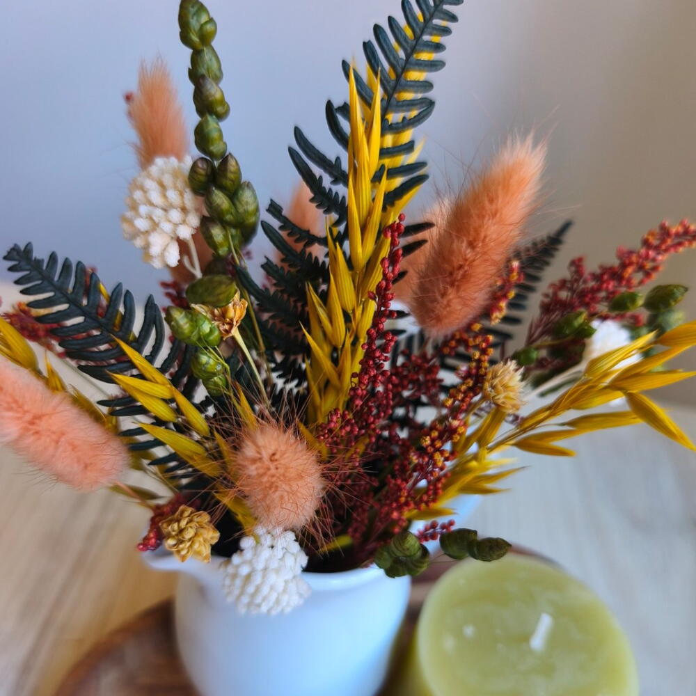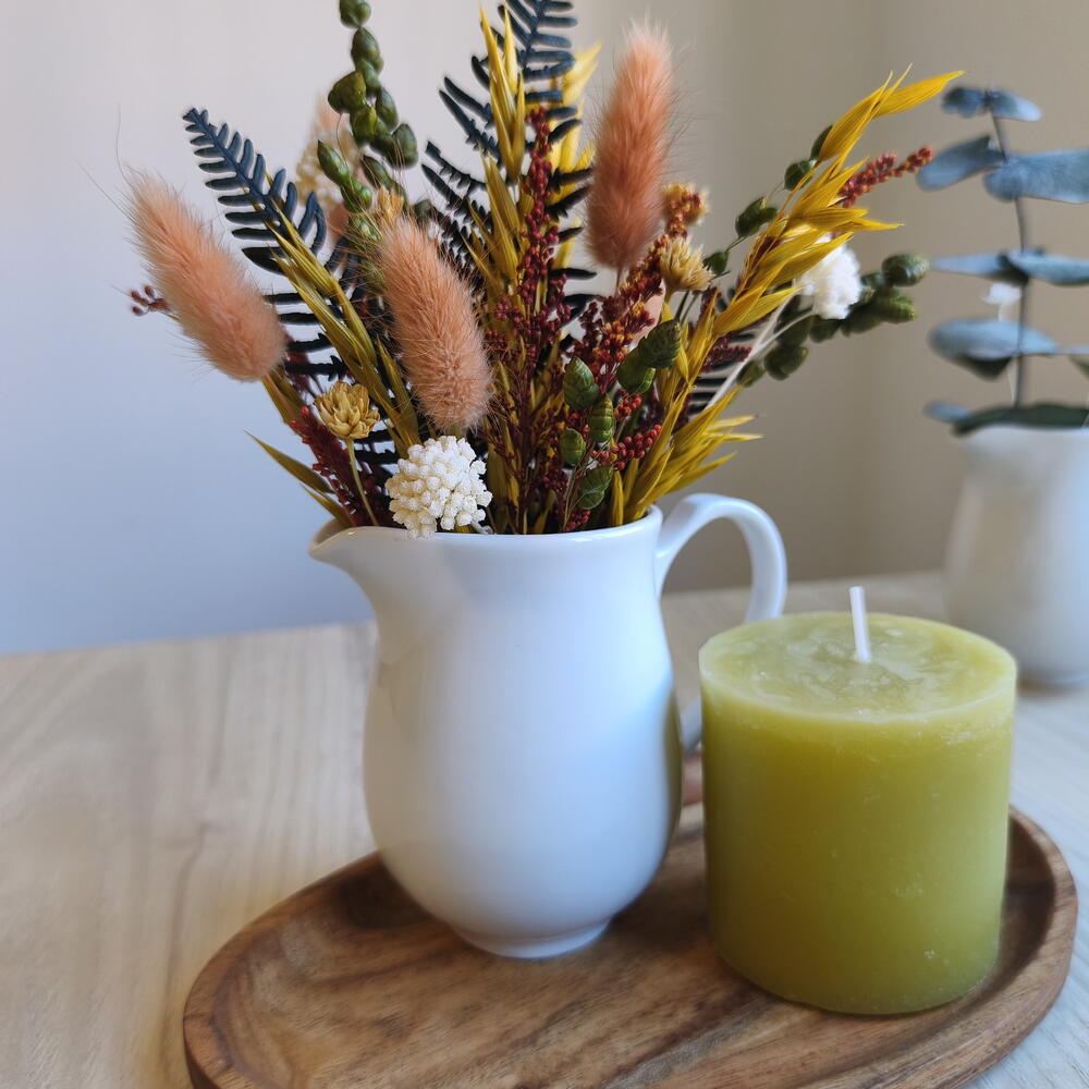 Centro decorativo de flores secas en tonos cálidos, presentado en una jarrita blanca y acompañado de una vela sobre bandeja de madera. Incluye tarjeta a juego de regalo. Una composición elegante y natural que aporta un toque acogedor a cualquier rincón del hogar. Ideal como regalo o como detalle decorativo para mesa, estantería o recibidor. Las flores secas y preservadas mantienen su belleza durante mucho tiempo sin necesidad de cuidados. Cada pieza está realizada a mano, por lo que puede presentar ligeras variaciones que hacen que cada composición sea única. Para facilitar el transporte y que el conjunto llegue en perfecto estado, los elementos se entregan suavemente fijados a la bandeja. Si lo prefieres, pueden retirarse fácilmente para colocar cada pieza de forma independiente.