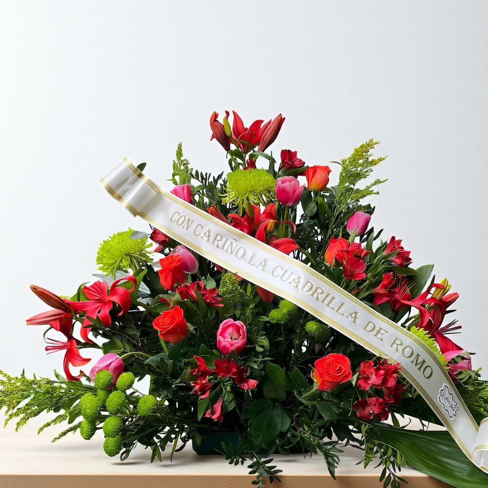 centro funerario grande en tonos rojizos compuesto por flor variada de temporada