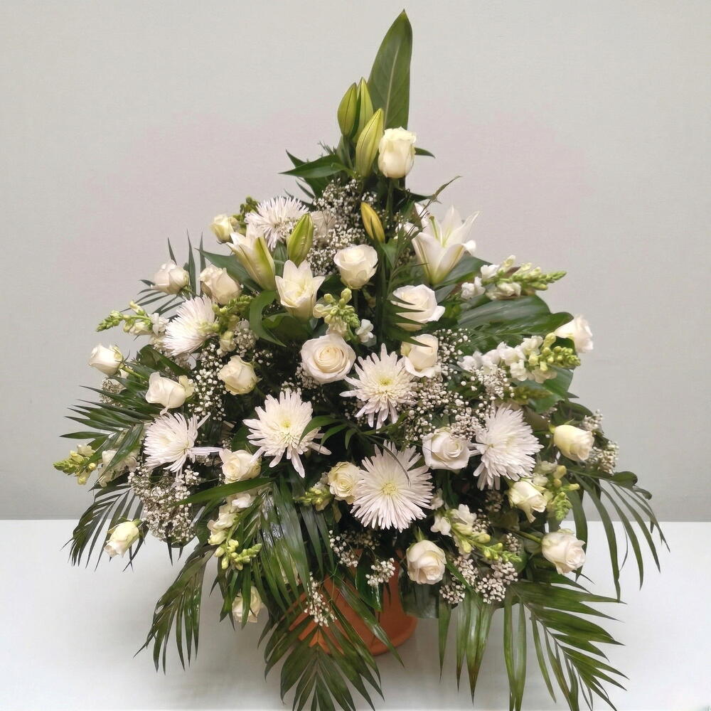 Un arreglo floral elegante en tonos blancos y verdes que transmite calma, pureza y armonía. La combinación de rosas, lirios y crisantemos crea una composición rica en textura y volumen, ideal para espacios solemnes o decoraciones refinadas. Los detalles de paniculata aportan ligereza y un toque etéreo al conjunto. El follaje verde enmarca las flores y resalta su luminosidad natural. Su forma equilibrada y ligeramente triangular le da una presencia distinguida y serena. Este diseño es perfecto para expresar respeto, apoyo o tranquilidad en momentos importantes. Para su cuidado, mantener en un lugar fresco, evitar la luz solar directa, añadir agua regularmente a la base y retirar flores marchitas para conservar su frescura.
