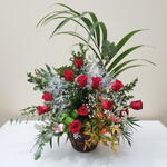 Este elegante arreglo floral combina la intensidad de las rosas rojas con una exuberante mezcla de follajes, creando una pieza llena de vida y romanticismo. Sus hojas verdes y plateadas se abren como un abanico que abraza suavemente cada rosa, dando una sensación de movimiento y frescura natural. Es un diseño ideal para expresar amor, admiración o celebrar momentos especiales con un toque sofisticado. La base en canasta aporta calidez artesanal, equilibrando perfectamente la riqueza del color y la textura. Para mantener su belleza por más tiempo, se recomienda mantener la esponja floral siempre húmeda y colocar el arreglo en un lugar fresco, lejos del sol directo o corrientes de aire.