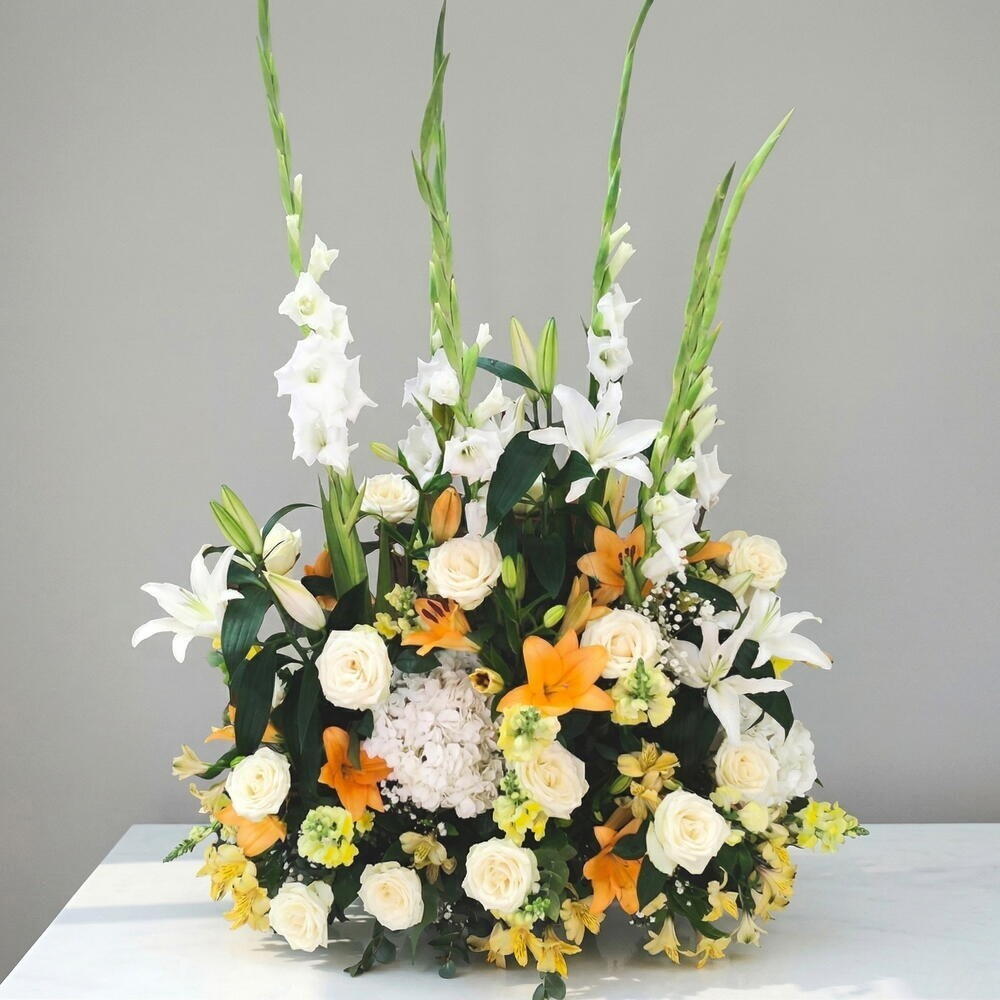 Un arreglo floral elegante y luminoso que combina tonos blancos y cálidos matices anaranjados, creando una composición llena de armonía y vida. La verticalidad de los gladiolos aporta estructura y distinción, mientras que los lirios y rosas añaden suavidad y elegancia. Los toques de flores en tonos naranja y amarillo brindan calidez y un contraste delicado que realza el conjunto. La hortensia aporta volumen y textura, equilibrando la composición de forma natural. Este diseño destaca por su estilo sofisticado y su capacidad de transmitir serenidad con un toque de luz. Ideal para homenajes, celebraciones o espacios que requieren una presencia floral refinada. Para su cuidado, mantener en un lugar fresco, evitar el sol directo, añadir agua regularmente a la base y retirar las flores marchitas para prolongar su frescura.