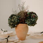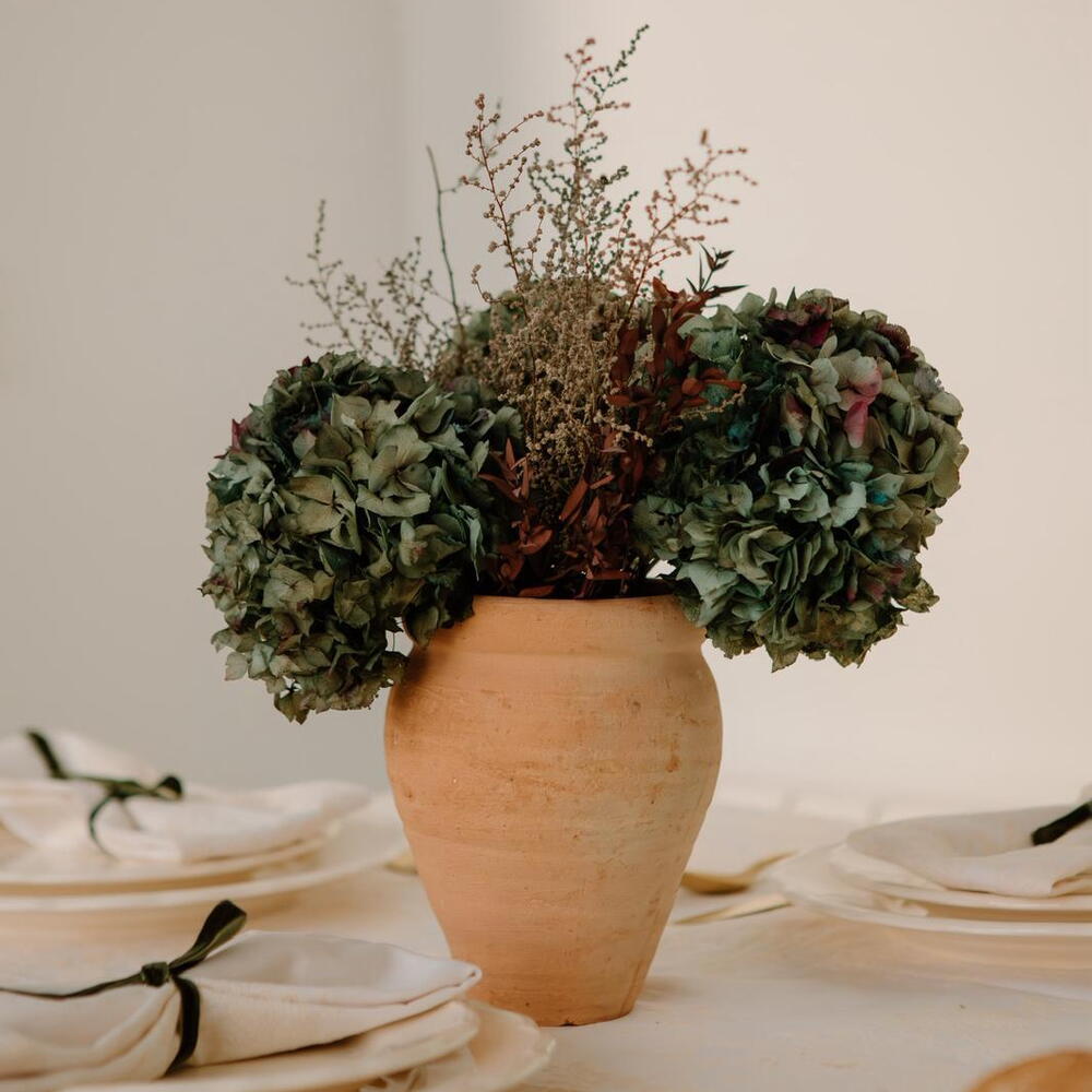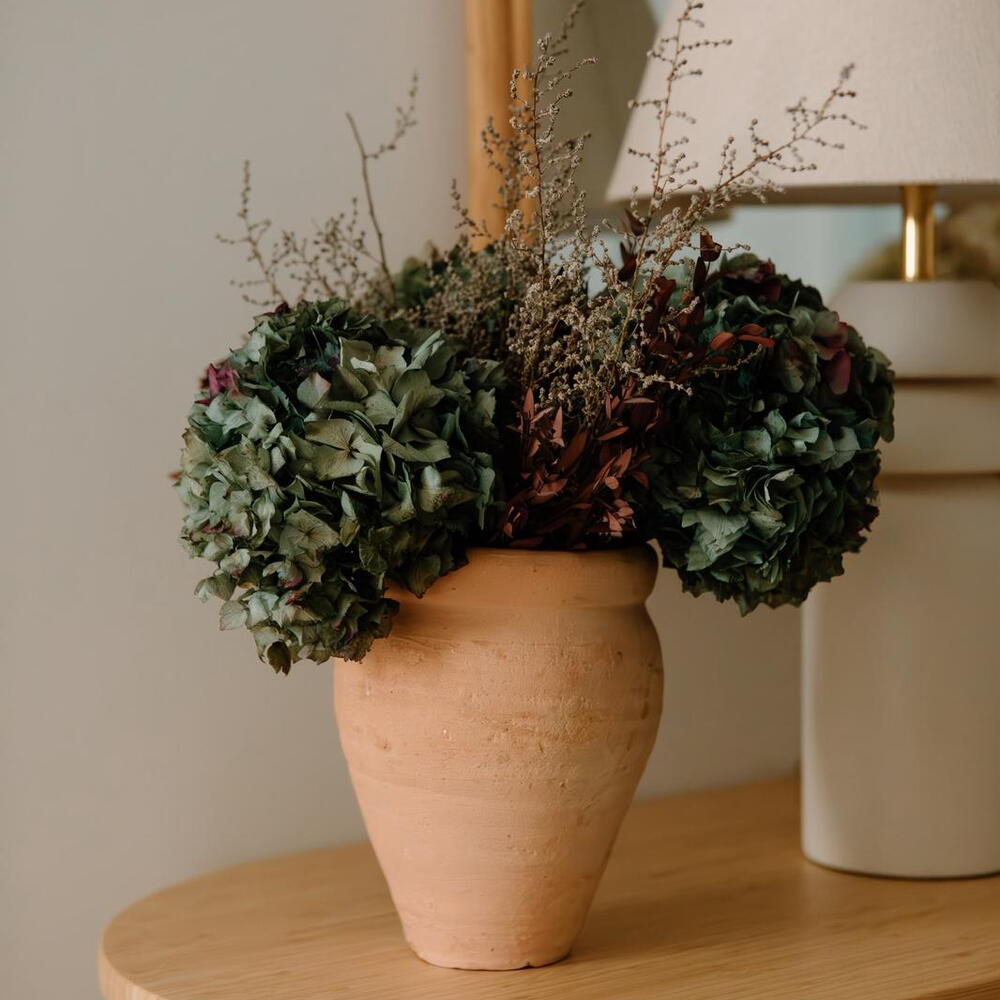 Centro decorativo elaborado con hortensias preservadas en tonos verdosos, combinado con astilbe y eucalipto burdeos. Presentado en una jarrón de barro natural, aporta un estilo acogedor y orgánico. Ideal para mesas de comedor, estanterías o cómodas. ✨ Cada pieza es única y realizada de forma artesanal.