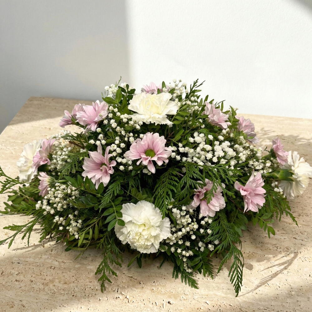 El Centro pequeño Luz Eterna es un arreglo floral delicado y armonioso, ideal para transmitir cariño, serenidad y recuerdo en cualquier ocasión especial o conmemorativa. Su diseño bajo y equilibrado combina flores clásicas en tonos suaves con verdes naturales, creando una composición elegante y atemporal. Es una opción perfecta para decorar espacios interiores, acompañar un mensaje de apoyo o rendir un homenaje discreto y lleno de sensibilidad. Elaborado artesanalmente con flores frescas, este centro floral destaca por su estética cuidada y su excelente relación calidad-precio.