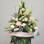 Un arreglo floral elegante y sobrio en tonos blancos que transmite paz, respeto y acompañamiento en momentos delicados. Su diseño vertical aporta una presencia armoniosa y distinguida, ideal para expresar condolencias con delicadeza. Los lirios en botón y flor abierta se combinan con rosas y crisantemos, creando una composición equilibrada y luminosa. Los pequeños detalles de flores blancas aportan textura y ligereza al conjunto. El follaje verde enmarca el arreglo y realza la pureza de los tonos claros. Esta pieza destaca por su estilo clásico y su mensaje de serenidad. Para su cuidado, mantener en un lugar fresco, lejos del sol directo, añadir agua regularmente a la base y retirar flores marchitas para prolongar su frescura.