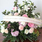 Arreglo floral de condolencia elegante y delicado, creado para expresar cariño y respeto en momentos de despedida. La combinación de rosas blancas y rosas, claveles en tonos pastel, lirios blancos y hortensias lilas forma un conjunto armonioso que transmite paz y consuelo. La cinta personalizada permite un mensaje afectuoso y cercano. Para mantener la frescura de las flores, se recomienda pulverizar ligeramente con agua a diario y situar el arreglo en un lugar fresco, evitando la luz solar directa y las corrientes de aire.