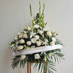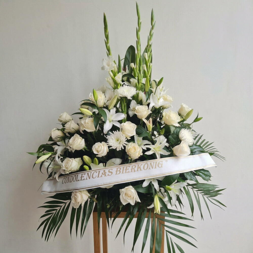 Un elegante arreglo floral en tonos blancos que transmite paz, respeto y pureza en los momentos más sensibles. Su composición vertical aporta solemnidad y presencia, convirtiéndolo en una pieza ideal para homenajes y condolencias. Los lirios abiertos se mezclan con rosas suaves y crisantemos, creando una armonía delicada y serena. Las líneas altas de los gladiolos aportan altura y distinción, mientras que el follaje verde enmarca el conjunto con frescura natural. Este diseño destaca por su equilibrio y su estética clásica, perfecta para expresar apoyo y cariño. Cada elemento ha sido cuidadosamente seleccionado para transmitir calma y acompañamiento. Para su cuidado, mantener en un lugar fresco, lejos del sol directo, añadir agua regularmente a la base y retirar flores marchitas para prolongar su belleza.