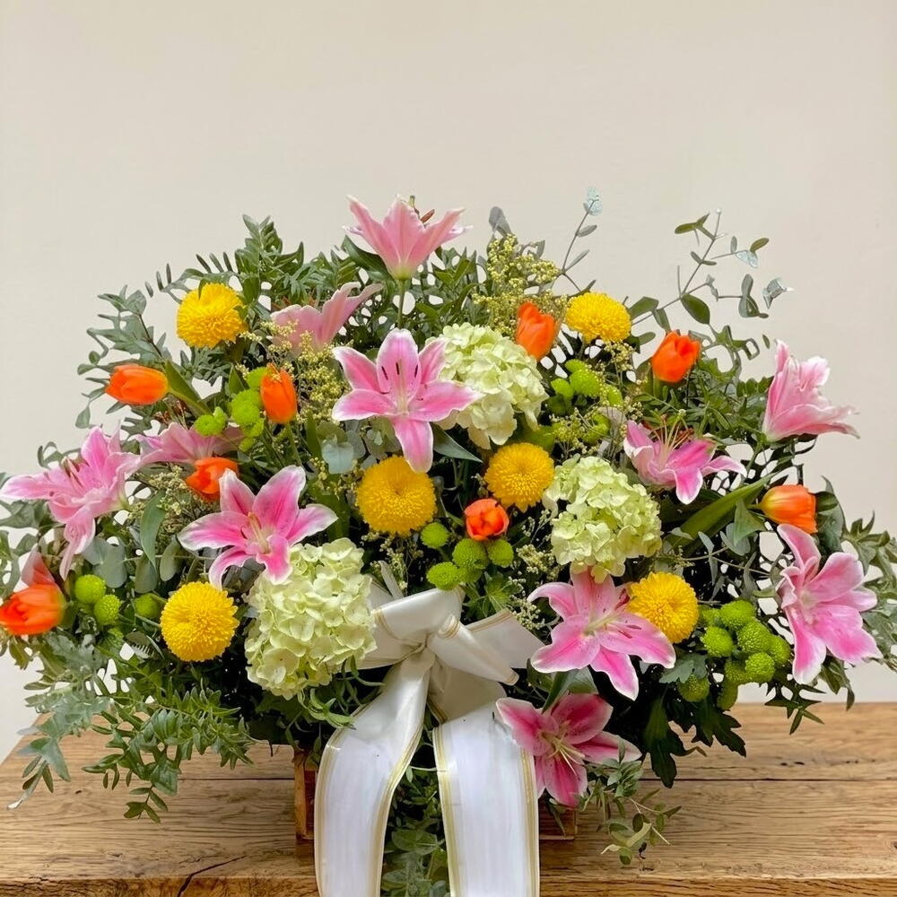 Es un arreglo floral diseñado con respeto, delicadeza y armonía para rendir homenaje en los momentos más delicados. Cada flor ha sido seleccionada con esmero para transmitir consuelo, cariño y respeto hacia los seres queridos que han partido. Compuesto por flores de colores suaves y cálidos, este centro floral es ideal para expresar tus condolencias de forma sensible y elegante. El color o tipo de flor podría variar según disponibilidad.
