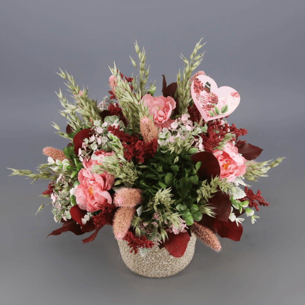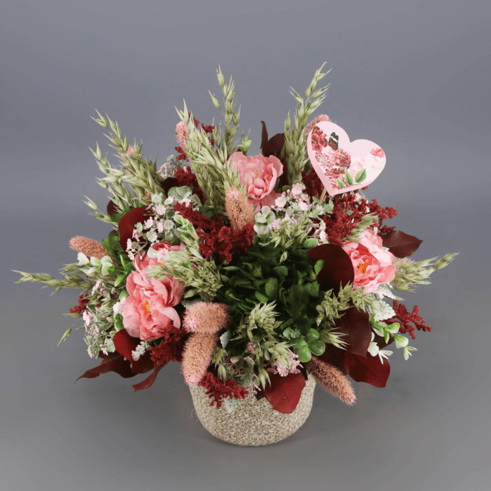 hortensia preservada rosa - 2 ud. eucalipto preservado. - 3 ud. ruscus preservado. - 4 ud. rosas preservadas color rosa. - 3 ud. rosas preservadas color rojo. - 2 ud. limonium preservado. - 3 ud. floral seca. - 1 ud. maceta decorativa. - 1 ud.