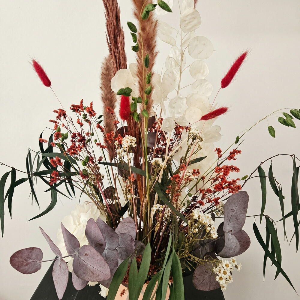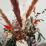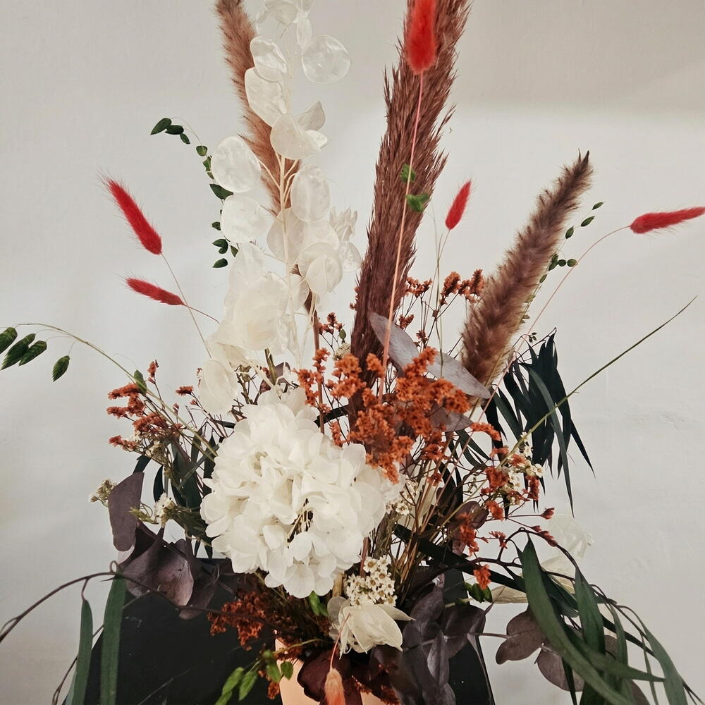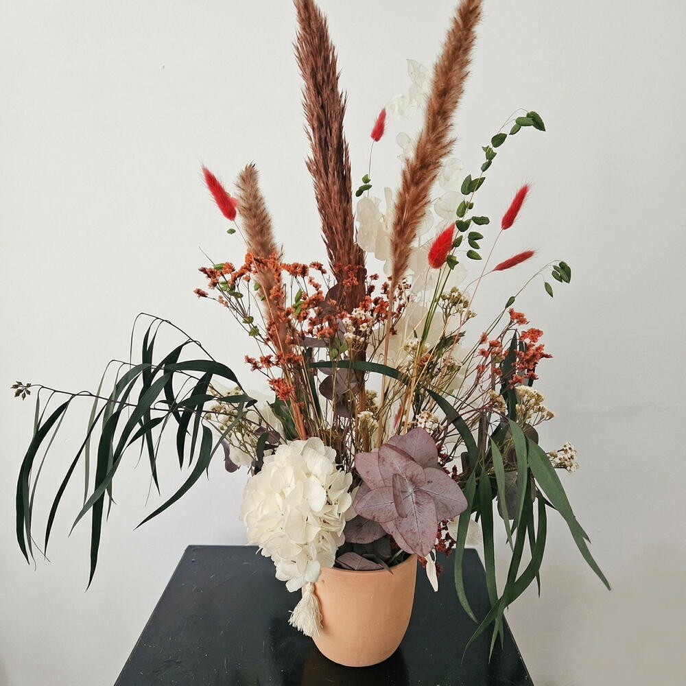 hortensia preservada - 2 ud. centro - 1 ud. flores de cera - 6 ud. eucalipto cinerea preservado - 3 ud. eucalipto parvifolia preservado - 3 ud. statice seco - 2 ud. espigas de pampas - 3 ud. tallos de lagurus - 5 ud.