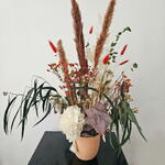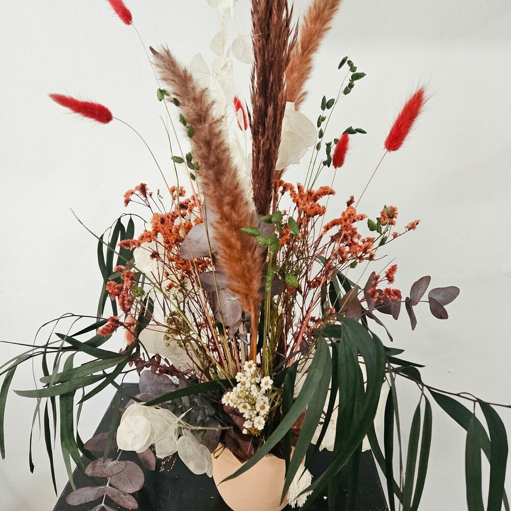 Un arreglo decorativo de estilo natural y bohemio que combina flores secas y preservadas en una elegante maceta, creando una composición única y duradera. Sus tonos cálidos y neutros aportan un aire acogedor y sofisticado, ideal para decorar cualquier espacio con un toque orgánico. La mezcla de texturas, desde plumas suaves hasta hojas delicadas, genera un diseño visualmente atractivo y moderno. Este arreglo es perfecto para regalar o para ambientar interiores con estilo minimalista o rústico. No requiere mantenimiento, lo que lo convierte en una opción práctica y duradera. Ideal para ocasiones como inauguraciones, cumpleaños, regalos corporativos o decoración del hogar. Para su cuidado, se recomienda mantenerlo en un lugar seco, evitar la luz solar directa y no exponerlo a la humedad o corrientes de aire fuertes.