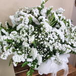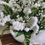 Este impresionante ramo de flores blancas evoca la suavidad de una nube flotando en un cielo despejado. Con una delicada mezcla de pequeñas flores blancas y un elegante follaje verde, este arreglo es símbolo de pureza y serenidad. Perfecto para ocasiones solemnes o para transmitir sentimientos sinceros de respeto y admiración. Su diseño voluminoso y etéreo lo convierte en una pieza central deslumbrante que llena cualquier espacio de paz y elegancia natural. Centro de peniculata y siempre viva en Blanco diseño floral para un momento,especial boda ,comunión Eventos, y fiesta