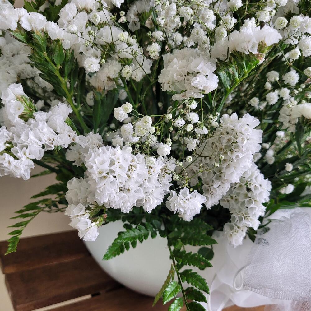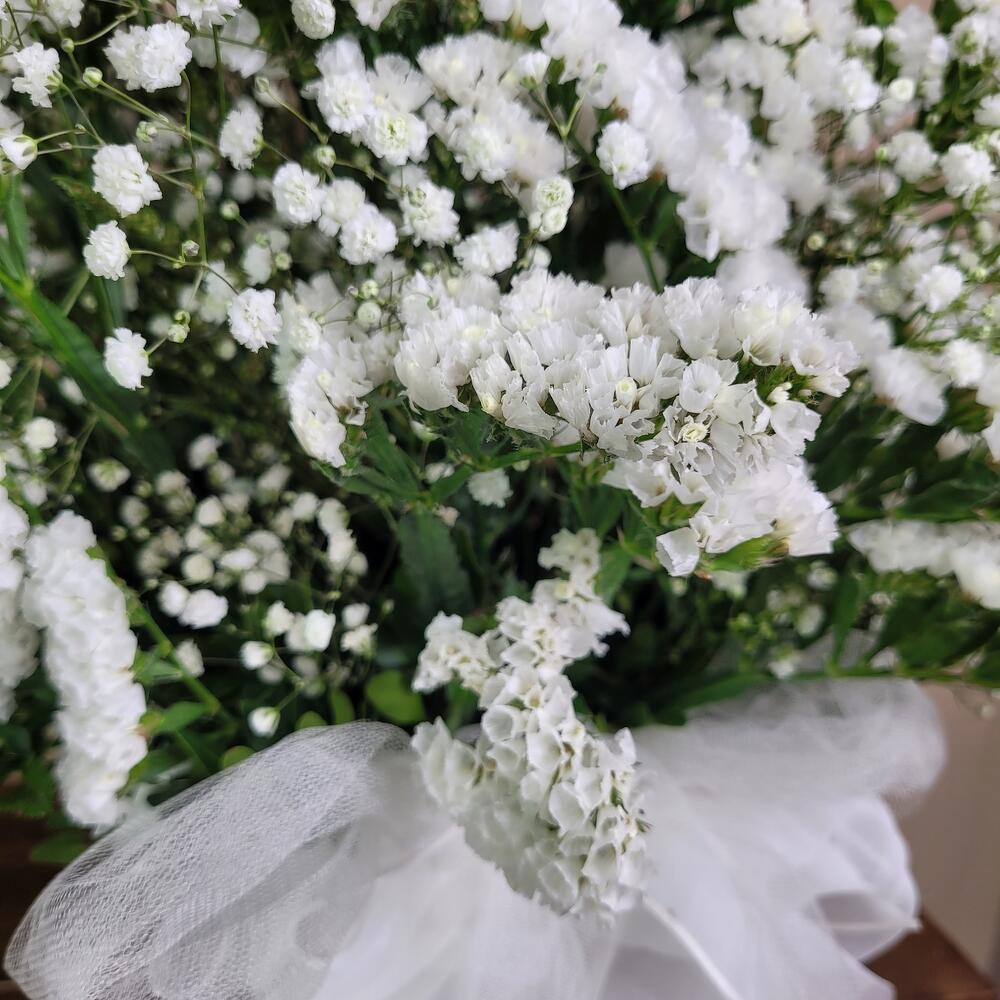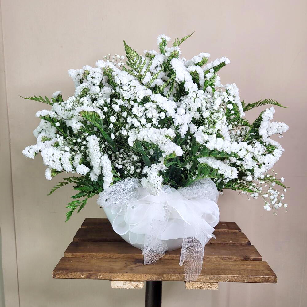 Este impresionante ramo de flores blancas evoca la suavidad de una nube flotando en un cielo despejado. Con una delicada mezcla de pequeñas flores blancas y un elegante follaje verde, este arreglo es símbolo de pureza y serenidad. Perfecto para ocasiones solemnes o para transmitir sentimientos sinceros de respeto y admiración. Su diseño voluminoso y etéreo lo convierte en una pieza central deslumbrante que llena cualquier espacio de paz y elegancia natural. Centro de peniculata y siempre viva en Blanco diseño floral para un momento,especial boda ,comunión Eventos, y fiesta