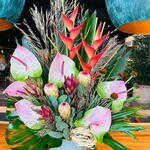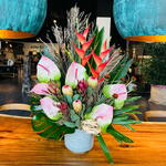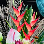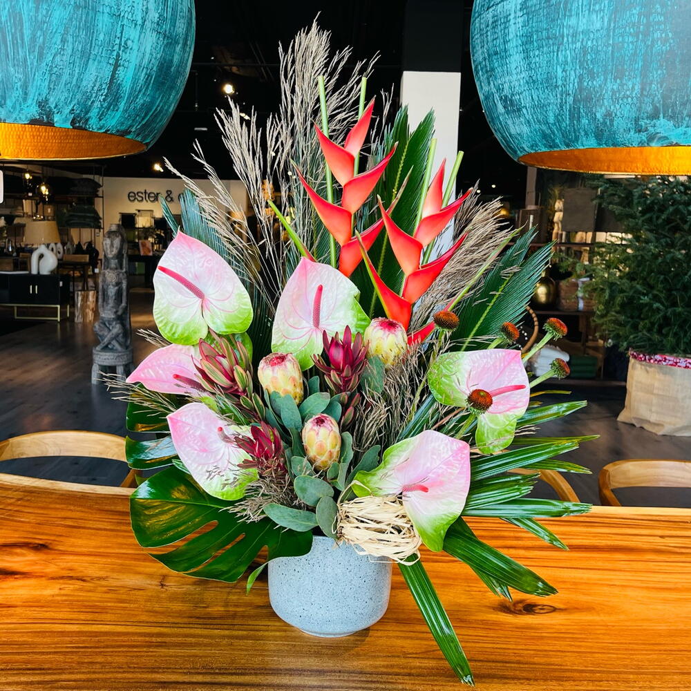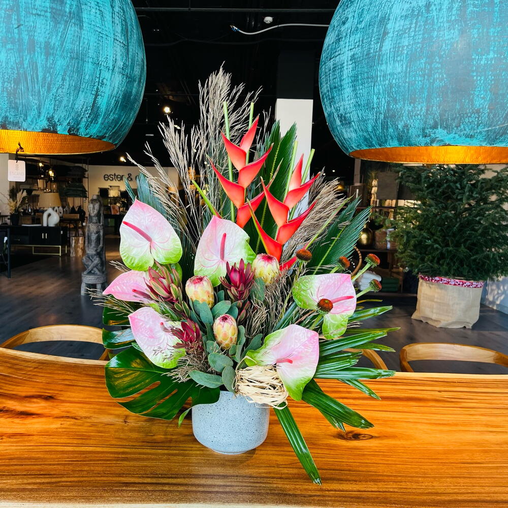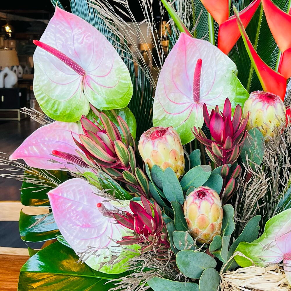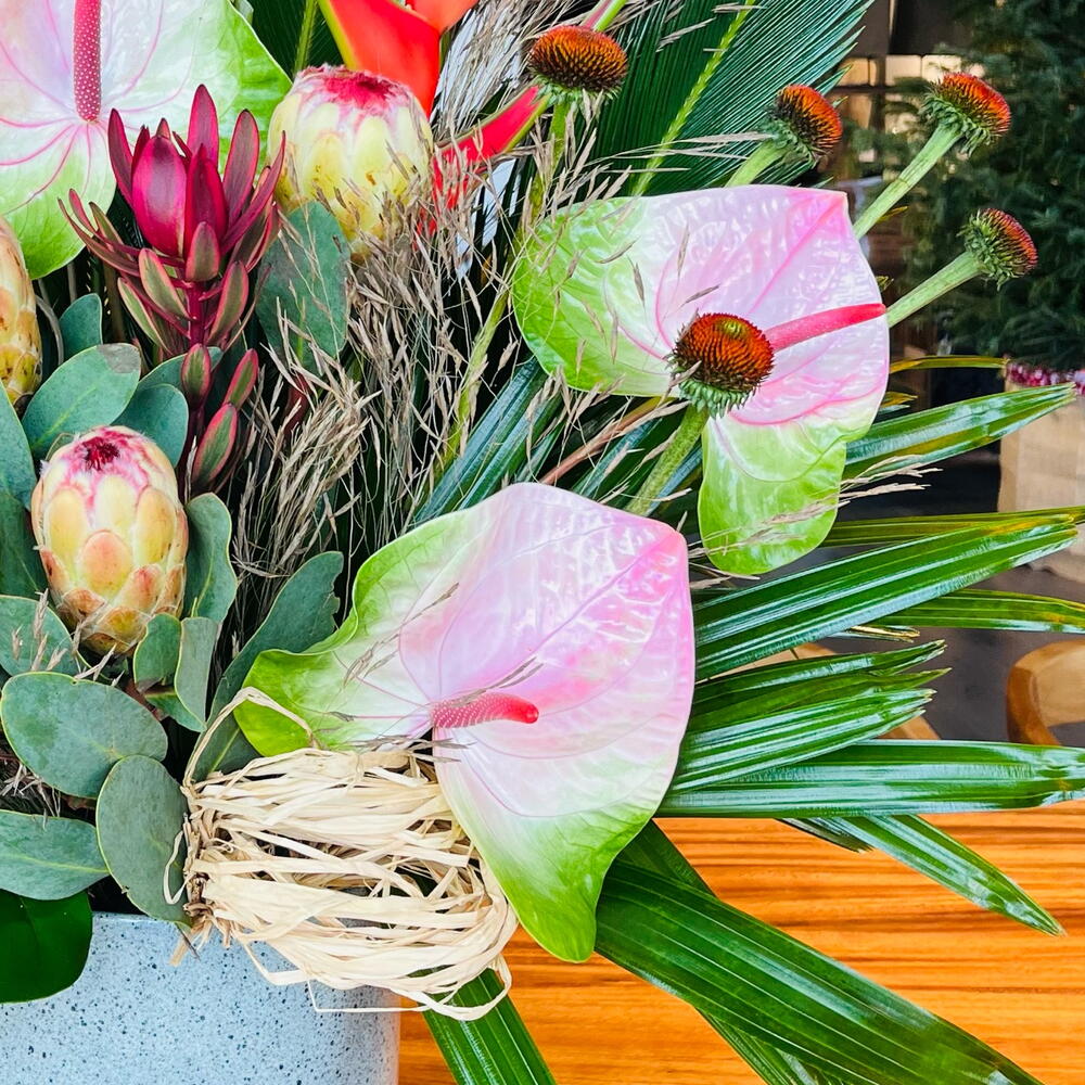 heliconia - 2 ud. anturium - 5 ud. protea - 3 ud. echinacea - 5 ud. monstera leaves - 3 ud. base ceramica - 1 ud. ld jester - 3 ud. rapais leaves - 3 ud. cica leaves - 3 ud. rama preservada - 3 ud.