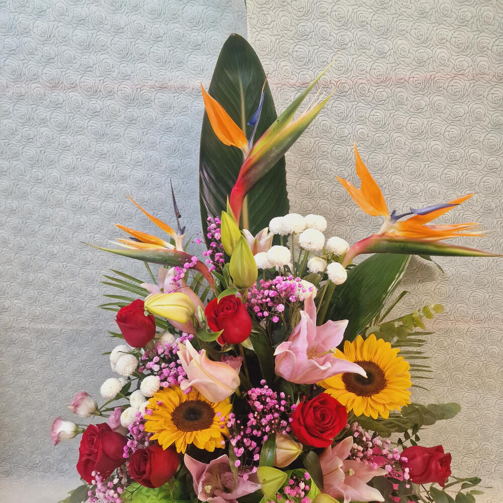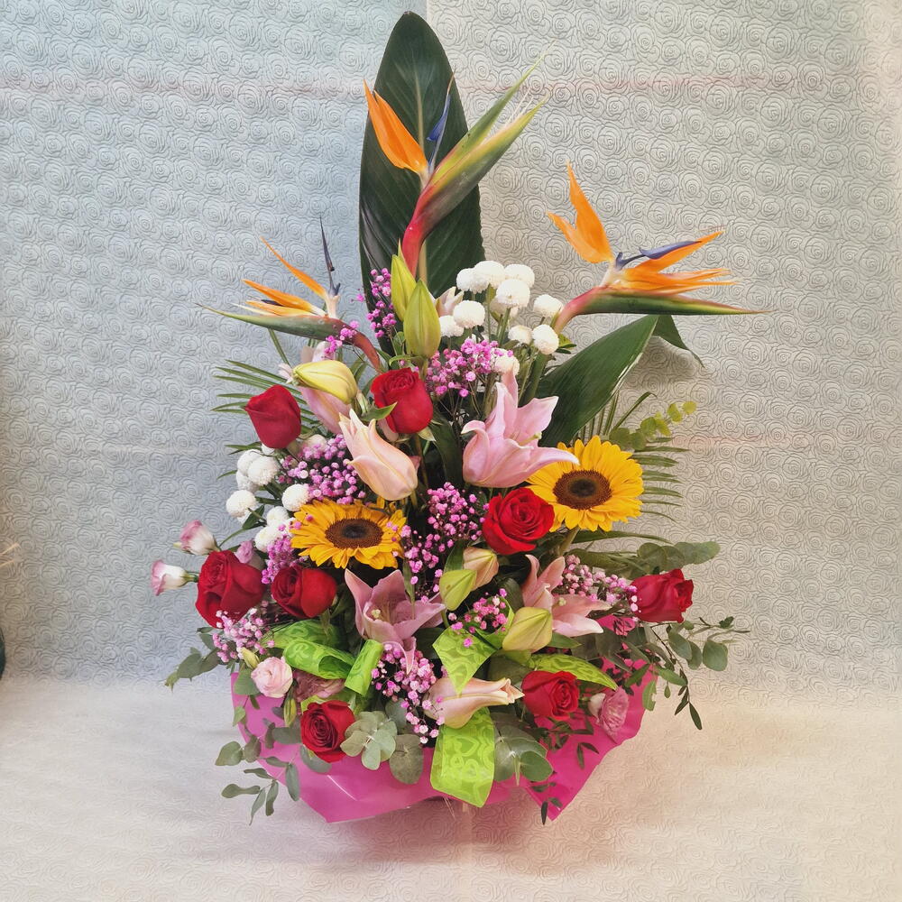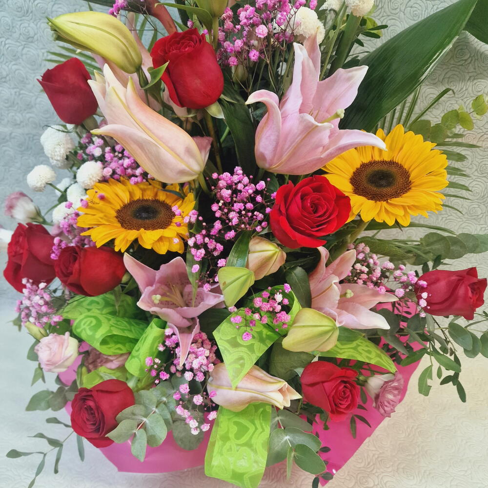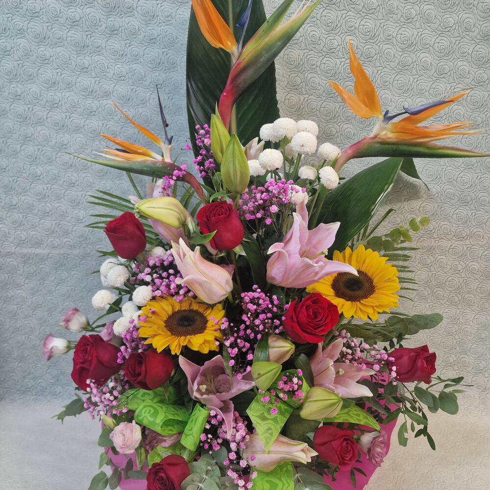 rosas rojas - 7 ud. verdes variados - 5 ud. lilium rosa - 2 ud. steretzia leaves - 3 ud. crisantemo botón blanco - 2 ud. girasol o gerbera amarilla - 2 ud. peniculata blanca o rosa - 3 ud. base con esponja - 1 ud. lazo y papel decoración - 1 ud.