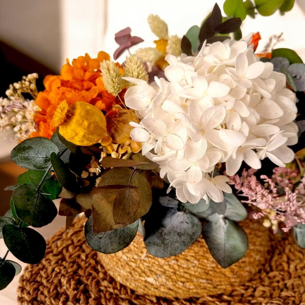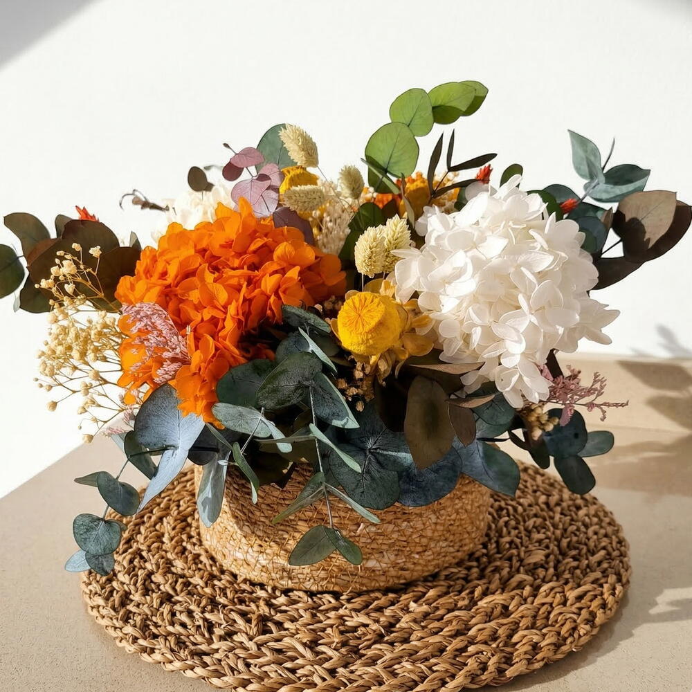 Este elegante cesto de mimbre destaca por su armoniosa combinación de flores secas y deshidratadas en tonos cálidos y naturales. Con hortensias naranjas y blancas como protagonistas, complementadas por eucalipto, craspedia amarilla y delicadas paniculatas, este arreglo es perfecto para añadir un toque de sofisticación y calidez a cualquier espacio. Ideal como regalo o para decorar hogares y oficinas, gracias a su estilo duradero y de bajo mantenimiento. Recomendaciones de cuidado: Las flores secas no requieren agua, lo que las hace increíblemente fáciles de mantener. Para que este arreglo conserve su belleza por más tiempo, evita exponerlo directamente a la luz solar, ya que esto podría desvanecer los colores. También es importante mantenerlo alejado de ambientes húmedos, lo que ayudará a prevenir el deterioro de las flores. Si acumula polvo, límpialo con un plumero suave o utiliza aire frío de un secador de cabello para eliminarlo delicadamente.