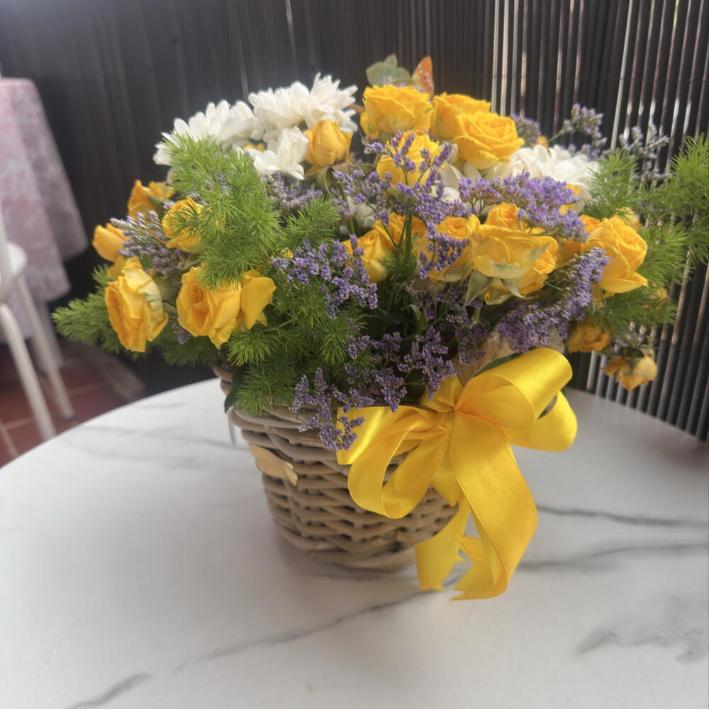 🌼 Arreglo “Alegría Radiante” – Flores que iluminan el corazón Llena de luz cualquier momento especial con este encantador arreglo floral en cesta, diseñado en tonos amarillos, blancos y toques de lavanda que transmiten felicidad, energía y ternura. Este delicado diseño combina rosas amarillas frescas, margaritas blancas y flores complementarias en una hermosa cesta decorativa con lazo, creando un detalle elegante y listo para regalar. 💛 Ideal para: • Cumpleaños • Agradecimientos • Recuperación / ánimo • Sorpresas especiales ✨ Características: • Flores frescas de alta calidad • Diseño en cesta (no necesita jarrón) • Colores vivos que transmiten alegría • Presentación cuidada con lazo decorativo 🚚 Entrega en la fecha seleccionada 📸 Foto previa disponible antes del envío Un detalle que ilumina el día y deja una sonrisa inolvidable 💐