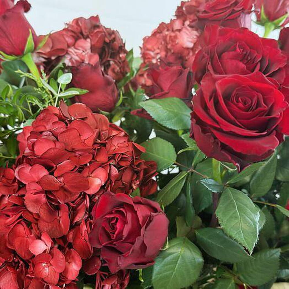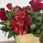 hortensia - 5 ud. verde variado - 20 ud. rosas rojas tallo largo - 30 ud. cesta de mimbre grande - 1 ud.