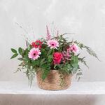 Gerbera - 5 ud. astilbe - 3 ud. rosas - 3 ud. verdes variados - 7 ud. cesta trenzada natural - 1 ud.