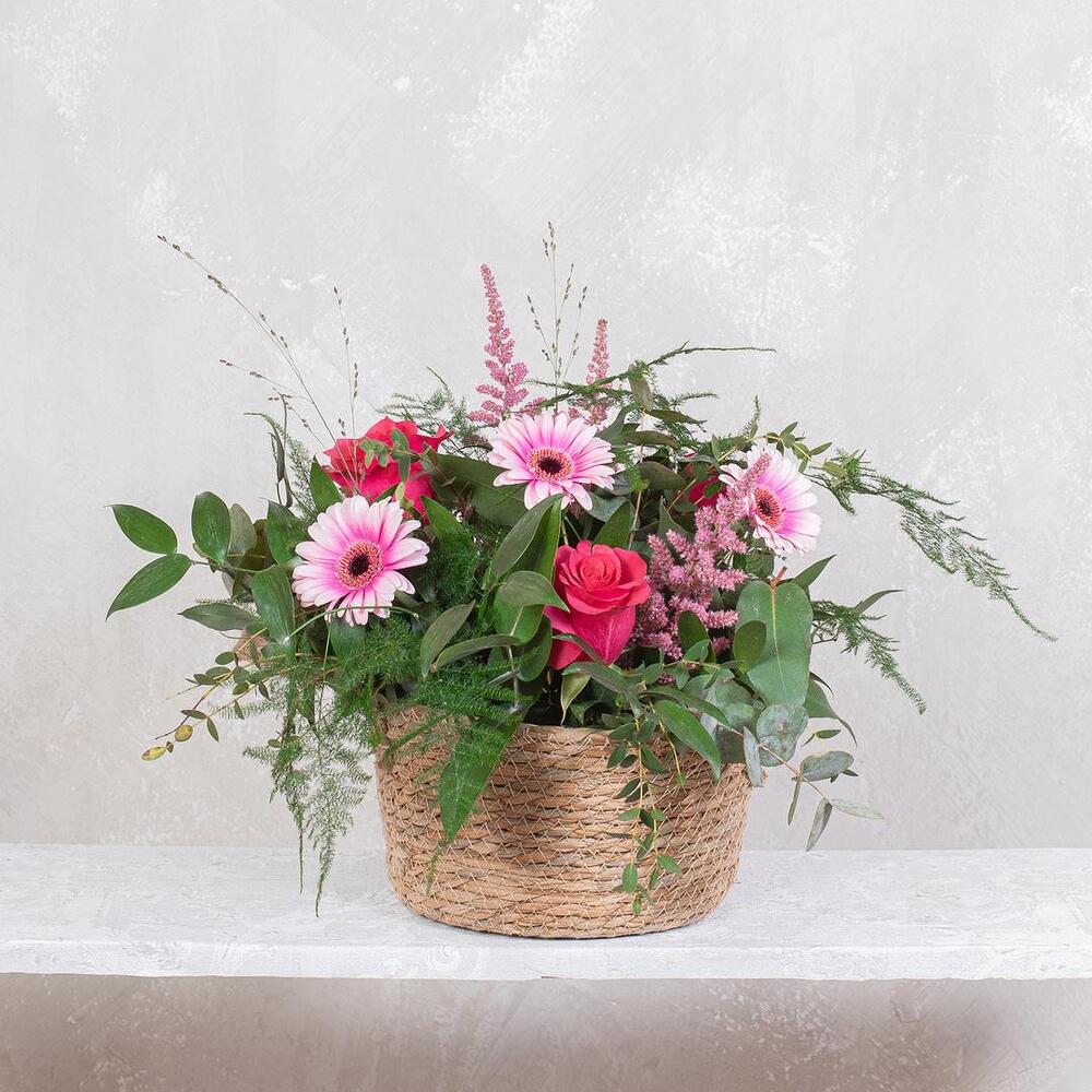 Gerbera - 5 ud. astilbe - 3 ud. rosas - 3 ud. verdes variados - 7 ud. cesta trenzada natural - 1 ud.