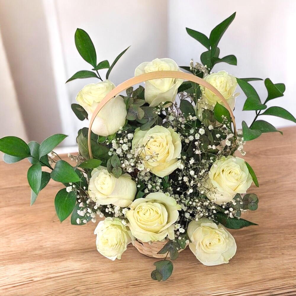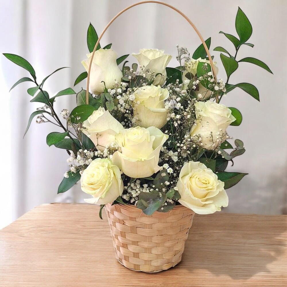 Este elegante arreglo floral combina la pureza de las rosas blancas con el toque delicado del follaje verde y los pequeños detalles de gypsophila. Perfecto para transmitir serenidad y aprecio, este diseño es ideal para ocasiones especiales como bodas, aniversarios o simplemente para decorar con estilo cualquier rincón de tu hogar. Presentado en una canasta tejida, añade un encanto rústico que realza su belleza natural. ¡Haz que cada momento sea inolvidable con este cautivador ramo!
