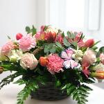 Cesta de mimbre de flores en tonos rosados. Un detalle romántico