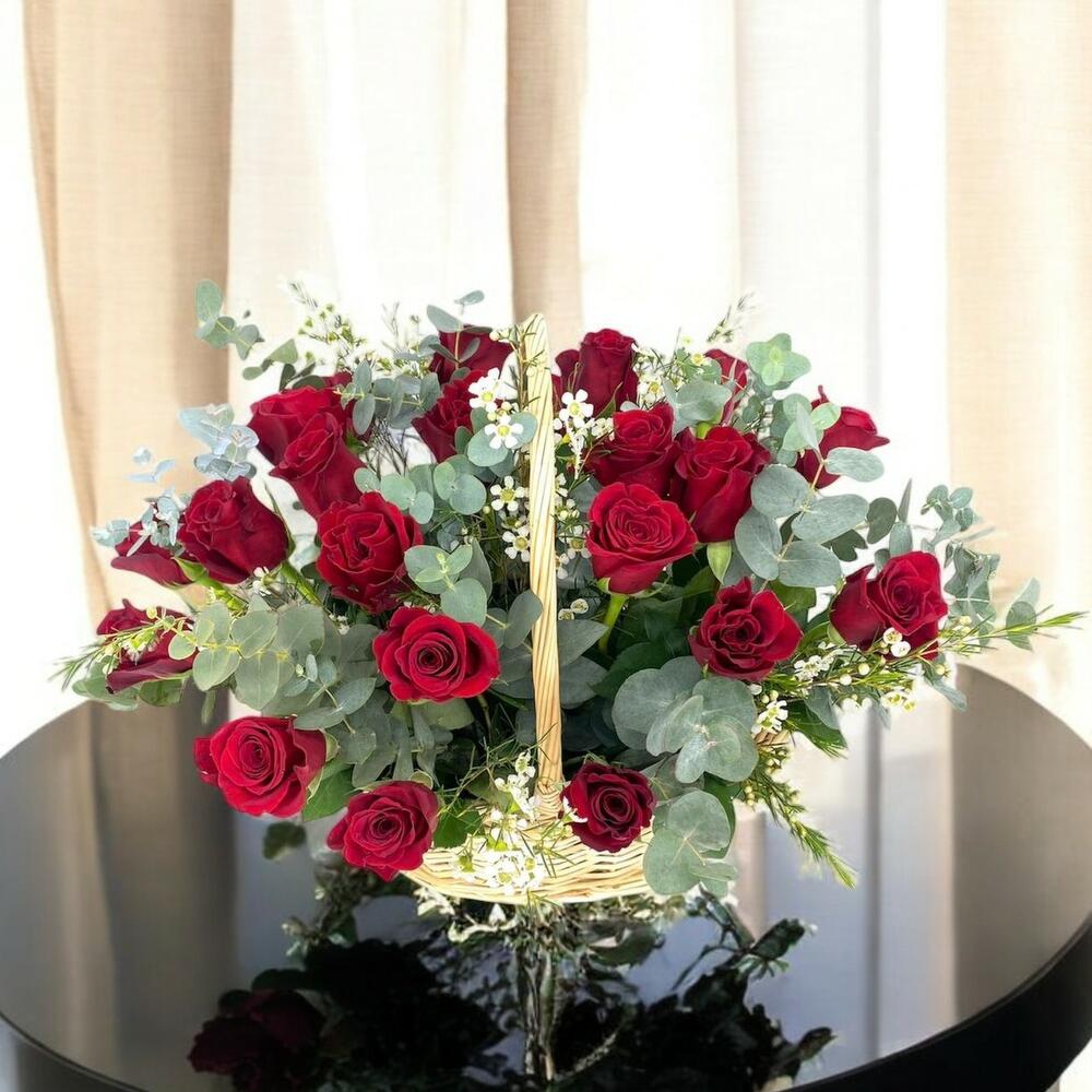 Un magnífico arreglo de rosas rojas en una elegante cesta tejida, complementado con eucalipto fresco y delicadas flores blancas. Este diseño floral destaca por su romanticismo y sofisticación, ideal para expresar amor, admiración o para celebrar ocasiones especiales. La cesta tejida aporta un toque rústico y natural, haciendo que este regalo sea tanto único como inolvidable.