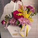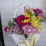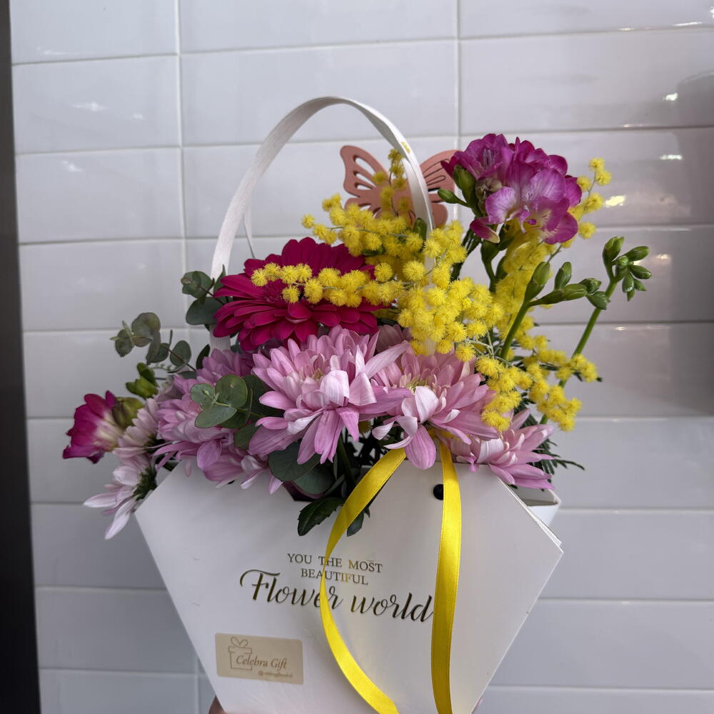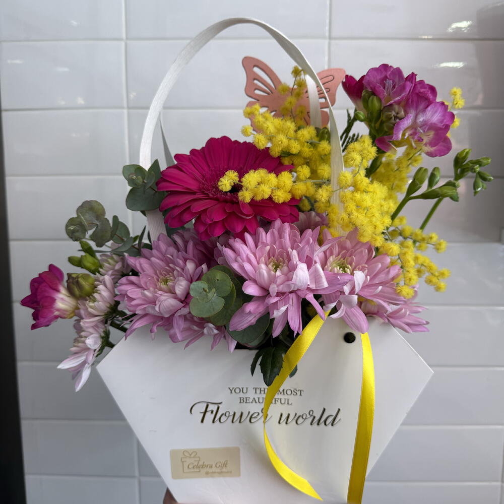 Gerbera - 1 ud. fresia - 2 ud. eucalipto - 3 ud. verdes varios - 3 ud. mimosas - 3 ud. pick decorativo - 1 ud. chocolatina - 1 ud. cesta de flores y cinta decorativa - 1 ud.